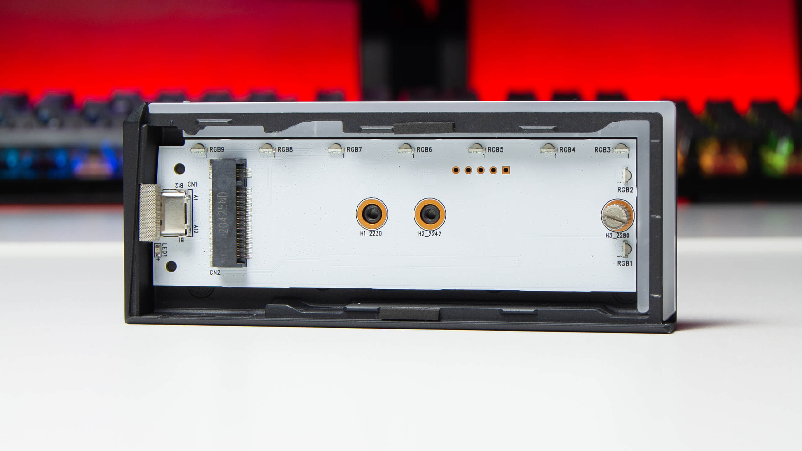 لم يكن الوصول الى مكان تثبيت وحدات M.2 المدعومة أمر صعب من دون استخدام أى ادوات فقط الضغط على الدبوس فى الجانب و سحب الغطاء للخلف و فى الداخل ستجد لوحة PCB باللون الأبيض مثبت عليها رأس توصيل من نوع M.2 و ثلاثة فتحات لتثبيت لمسمار الربط طبقا لطول وحدة M.2 المستخدمة و فى نهاية الطرف الأخر موصل من نوع USB Type-C