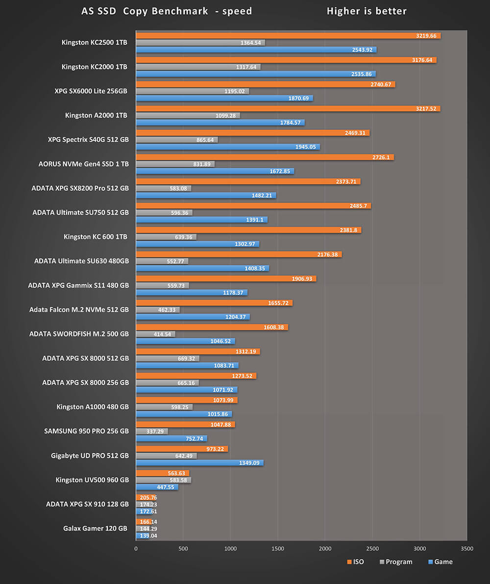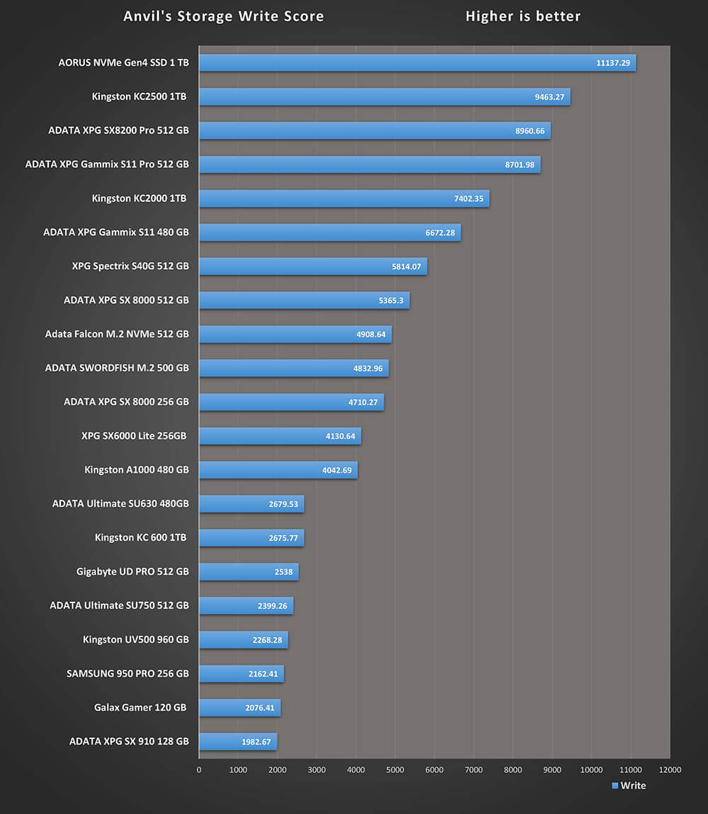 و اخر اختبار على تطبيق AS SSD هو اختبار سرعة الكتابة 4K 64 هي مقياس لمدى قدرة الجهاز على كتابة 4k كتل عشوائية من البيانات في طابور عام 64. نادرًا ما تحتاج أقراص الكمبيوتر العامة للمستخدم إلى خدمة أكثر من طلب واحد أو اثنين في الوقت الذي يجعل هذا الإجراء مناسبًا بشكل خاص للخوادم و نرى اختلافات فى نتائج اقراص التشغيل بشكل متفاوت نظرا لان هذه النتائج مرتبطة بشكل وثيق مع المتحكم