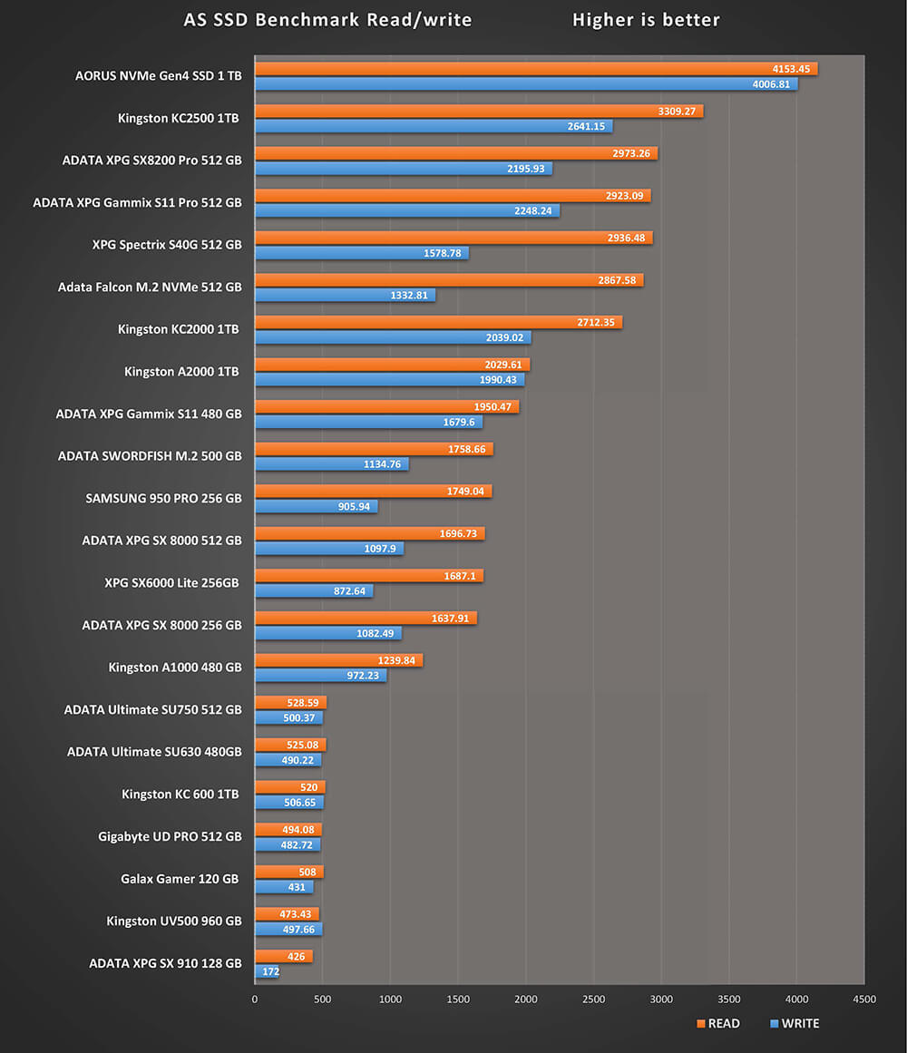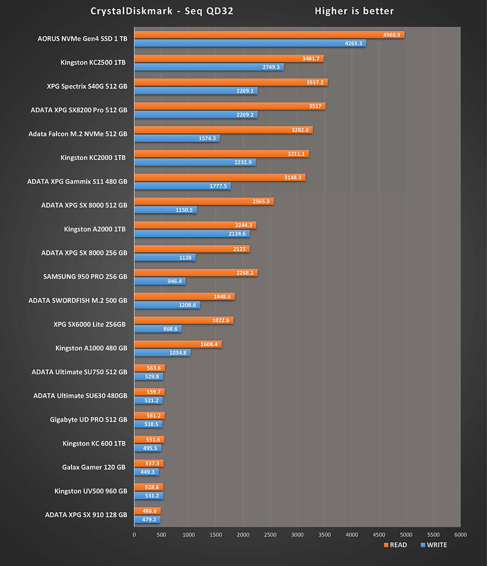 لأرقام تشير الى ان قرص التشغيل ADATA SWORDFISH يقدم أداء مقبول و يقع فى المنطقة المتوسطة بين محركات التشغيل الأخرى التى قمنا بأختبارها و سرعة القراءة تصل الى 1758 MB/s و الكتابة وصلت الى 1134 MB/s و هى ارقام مقبولة نوعا ما