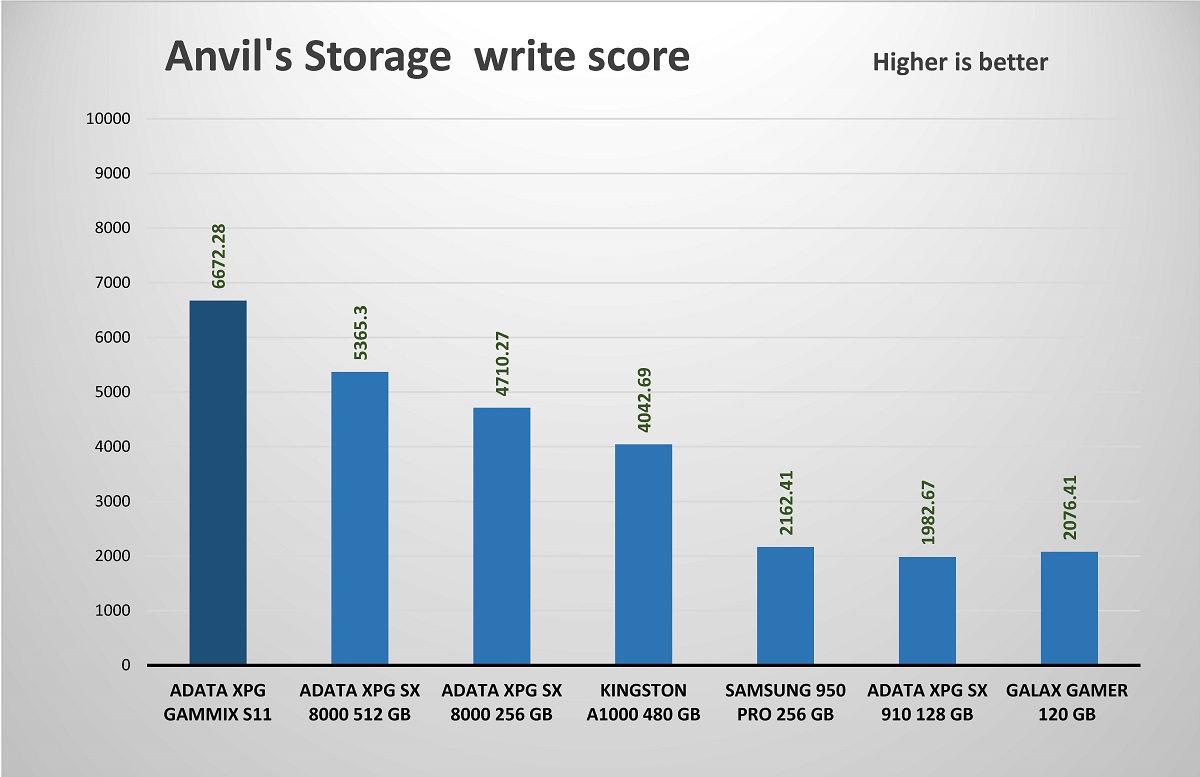 برنامج رائع لتقيم اداء الاقراص الصلبة حيث يوجد به العديد من الاختبارت ومنها عدد مرات القراءة والكتابة فى الثانية الواحدة وقرص الحالة الصلبة XPG GAMMIX S11 اعطى نتائج ممتازة جداً فى عدد العمليات الكتابية التى يستطيع انجازها بالثانية الواحدة