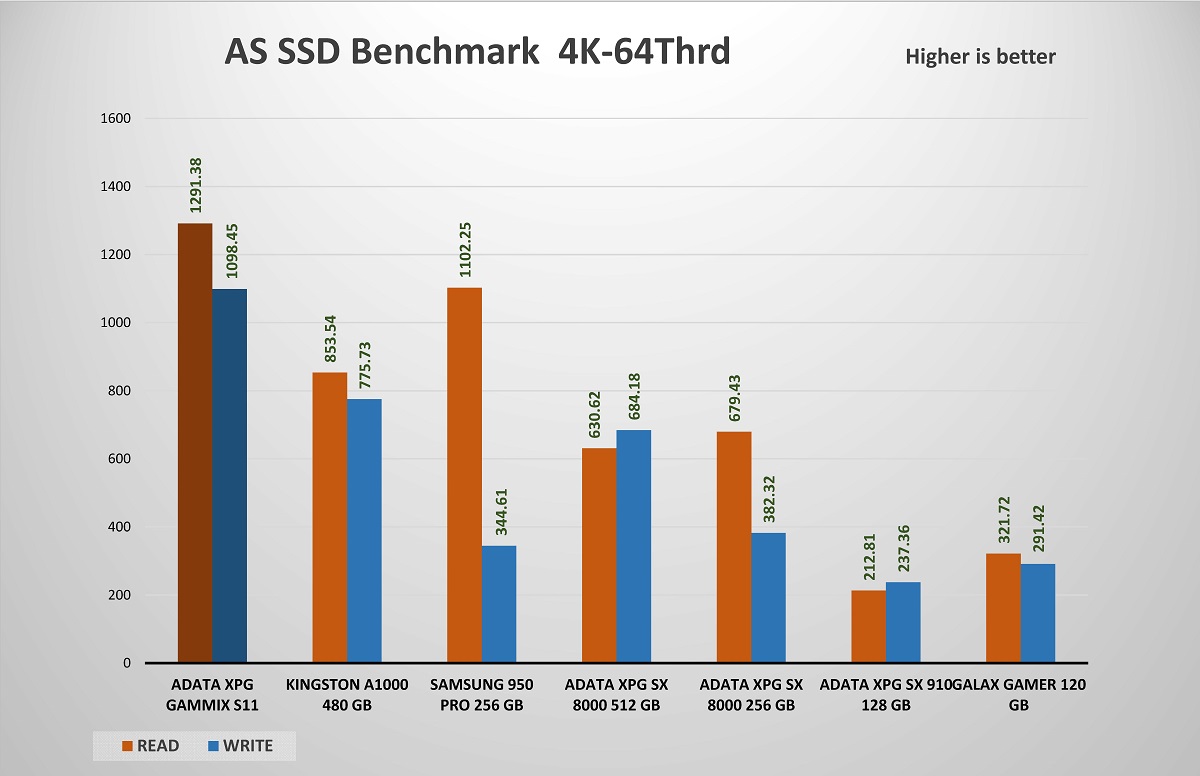 و اخر اختبار على تطبيق AS SSD هو اختبار سرعة الكتابة 4K 64 هي مقياس لمدى قدرة الجهاز على كتابة 4k كتل عشوائية من البيانات في طابور عام 64. نادرًا ما تحتاج أقراص الكمبيوتر العامة للمستخدم إلى خدمة أكثر من طلب واحد أو اثنين في الوقت الذي يجعل هذا الإجراء مناسبًا بشكل خاص للخوادم و نرى اختلافات فى نتائج اقراص التشغيل بشكل متفاوت نظرا لان هذه النتائج مرتبطة بشكل وثيق مع المتحكم