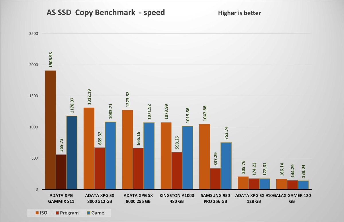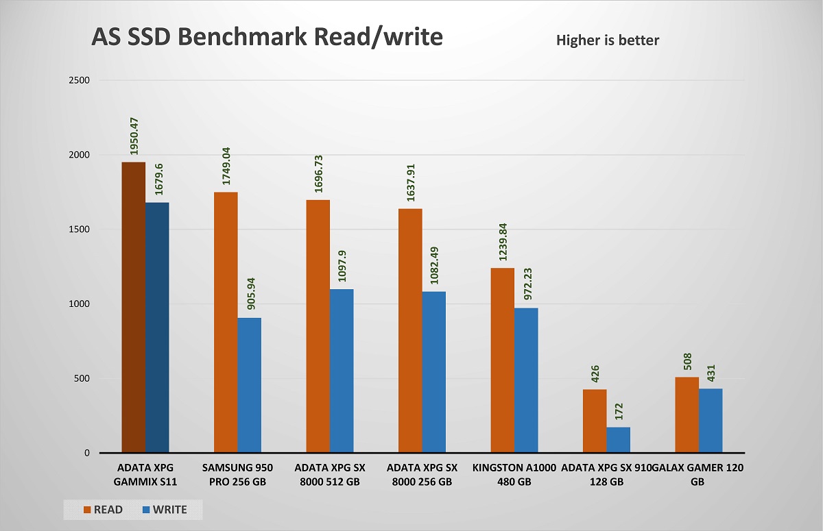 قبل التدقيق فى نتائج الاختبارات و المقارنات يجب الوضع فى الاعتبار ان معدل نقل البيانات مختلف و متدرج المستوى فهناك اقراص تعمل على منفذ SATA و اقراص تعمل على تقنية NVMe مع 4 مسارات PCIe فنجد في AS SSD ، بلغ متوسط نقاط 3775 نقطة و الأداء يأتي أقل قليلا في هذا الاختبار نظرا لان بعض تطبيقات الاختبارات تكون متوافقة بشكل اكبر مع متحكم مفضل لديها وهو أمر طبيعي اما تقارير الأداء التسلسلي بما يقرب من 2.0 جيجابايت / ثانية للقراءة و 1.7 جيجابايت / ثانية الكتابة. أداء 4K جيد جدًا مرة أخرى