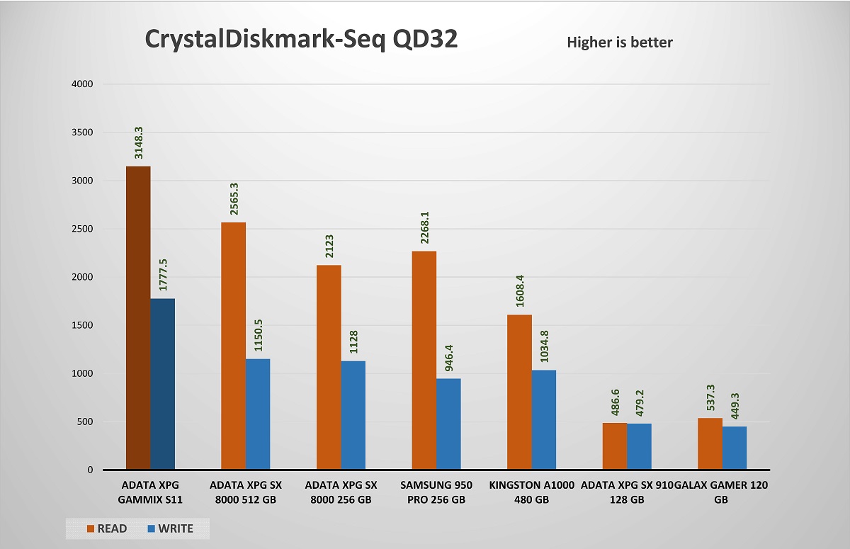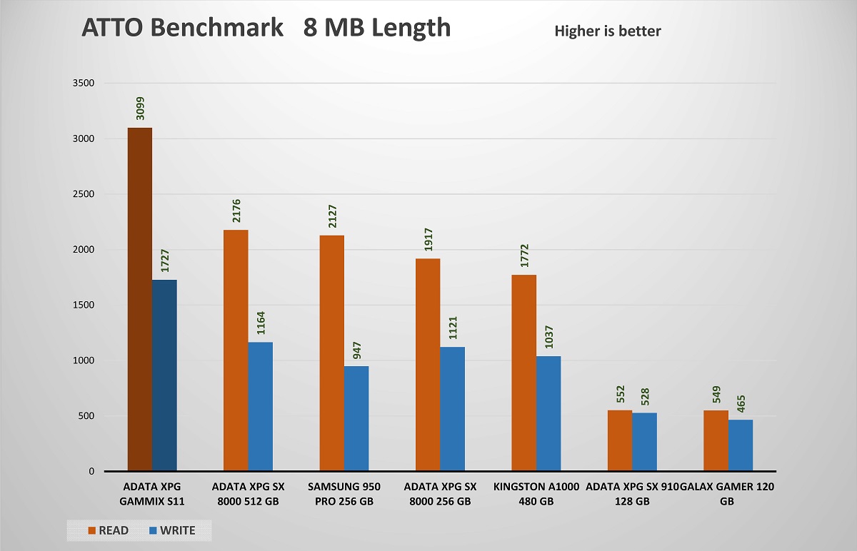 يوضح ATTO أن أداء XPG GAMMIX S11 لا يقدم أفضل أداء للملفات الصغيرة بأقل من 4 كيلو بايت ، ولكن أداءه في 4 كيلوبايت وما فوق جيد جدًا. بحجم الملف 16KB ، يتجاوز الأداء بالفعل حدود SATA. من 128KB نرى أكثر من 1.7GB / ثانية الكتابة وأكثر من 3GB / ثانية للقراءة
