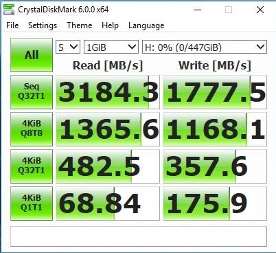 على عكس القاعدة فإن Crystal Mark Mark يعرض لنا نتائج أفضل من AS SSD. ما يقرب من 3.2GB / ثانية القراءة والكتابة فوق 1.7GB / ثانية. كما تم الكشف عن أداء 4K QD 1 ليكون جيدًا جدًا في القراءة ليصل إلى 63 ميجابايت / ثانية. 4K