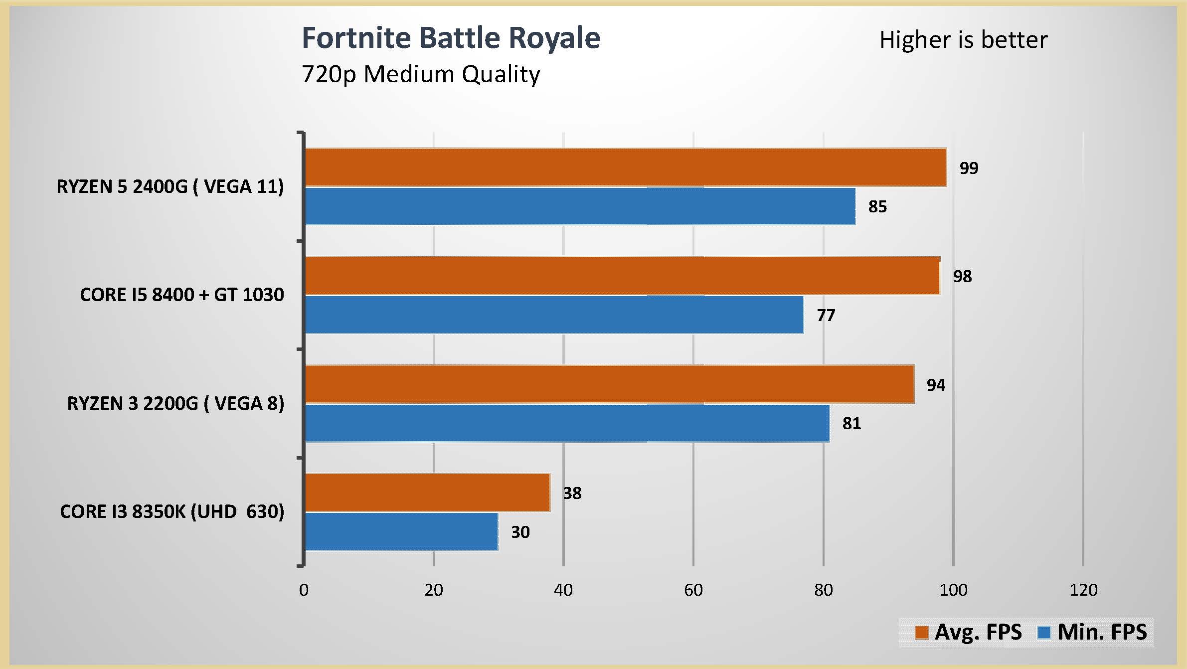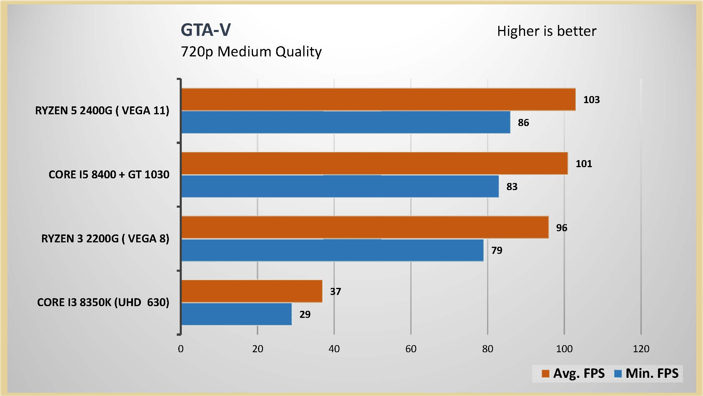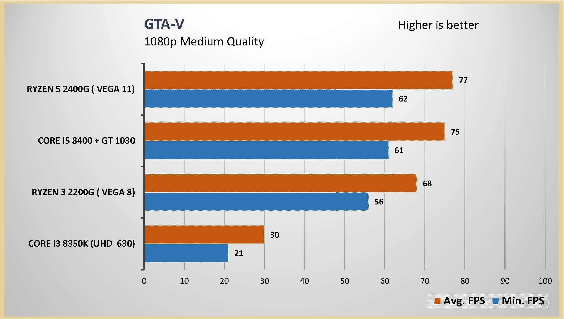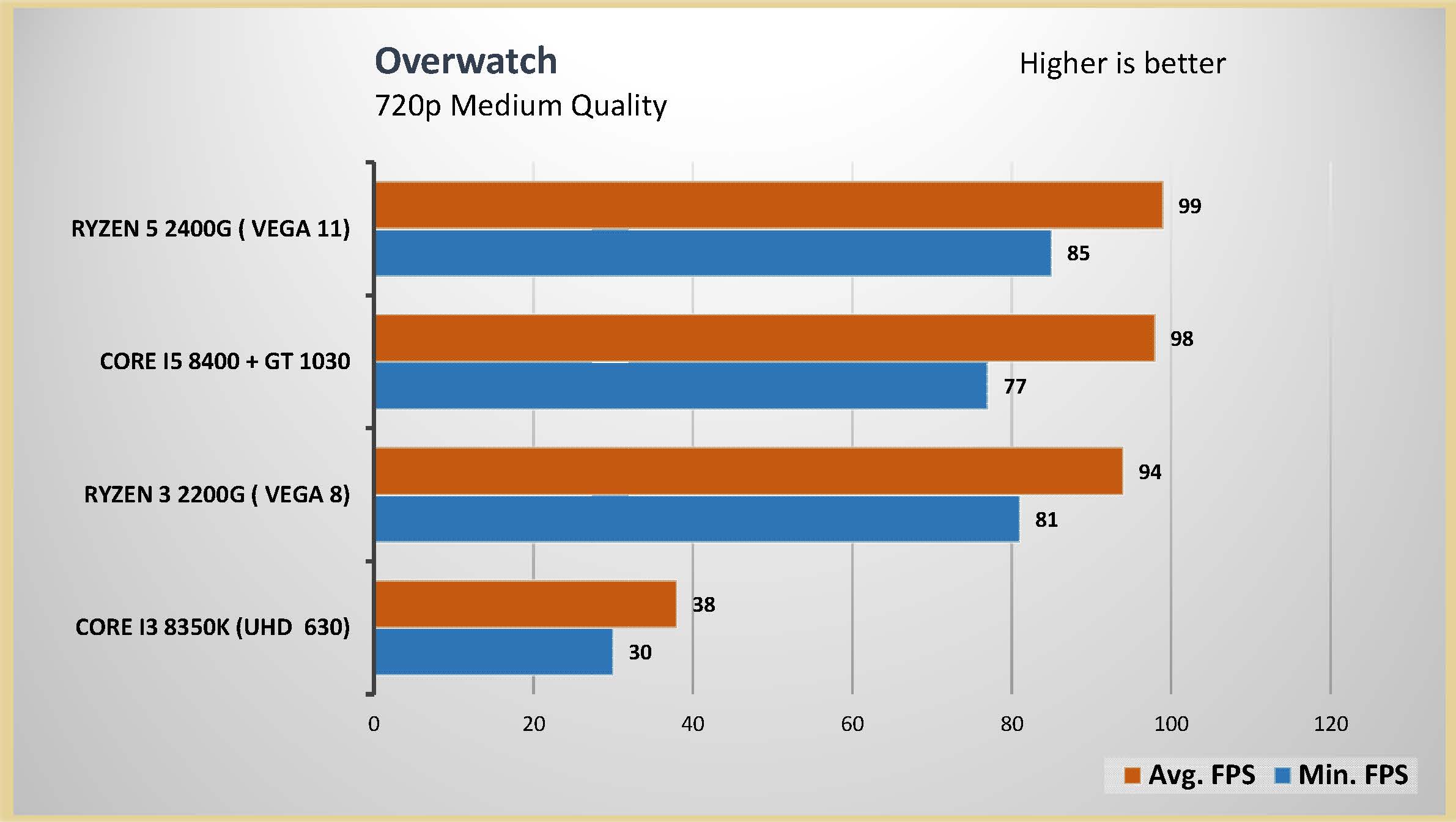 احتبرت المعالج الرسومى المدمج مع العديد من الالعاب على اعدادات متوسطة و اعدادات متقدمة على دقتين عرض مختلفتين 1080 و 720 لتقييم اداء المعالج الرسومى بشكل جيد و تم وضع البطاقة الرسومية GT 1030 فى المقارنة و ايضا المعالج الرسومى المدمج من انتل UHD 630 و هذه هى الفئة السعرية المقاربة للمعالجين Ryzrn 5 2400G و Ryzen 3 2200G و قد تكون اقل فى السعر اذا تم حساب سعر البطاقة الرسومية GT 1030