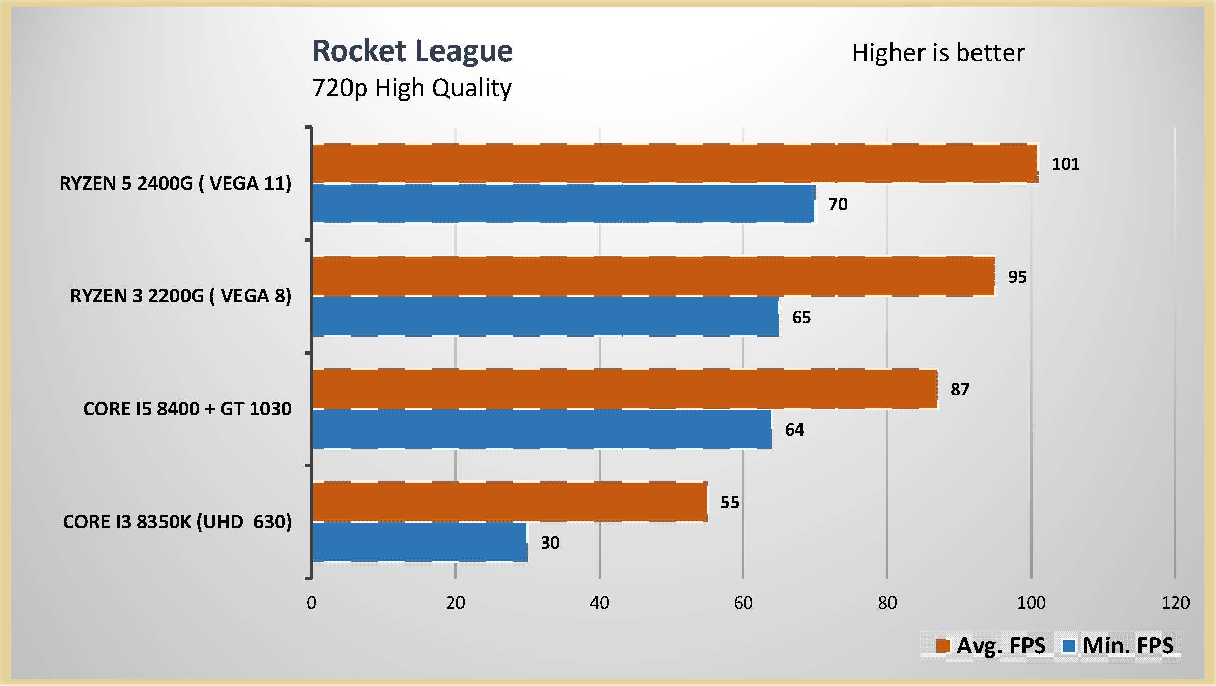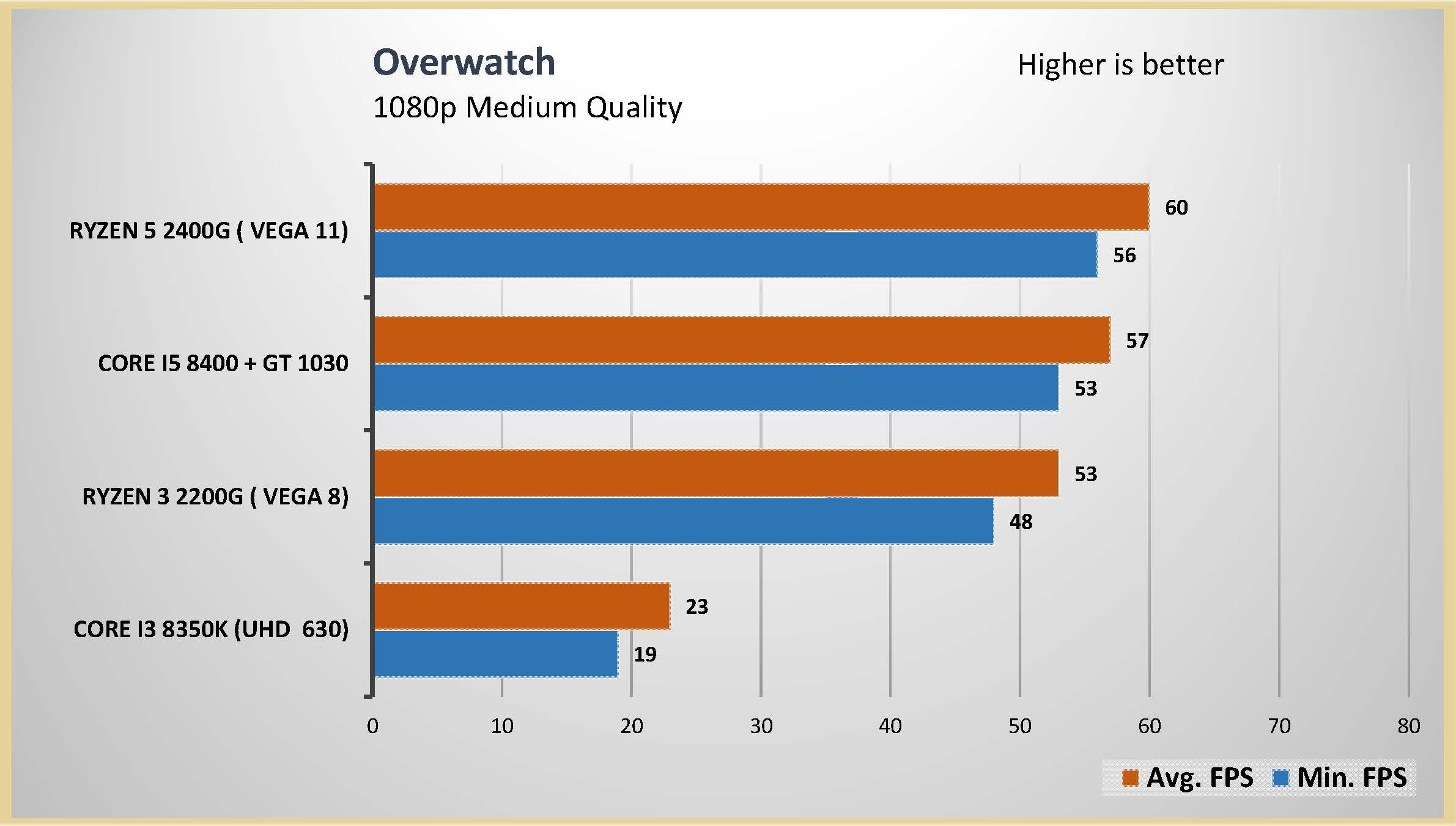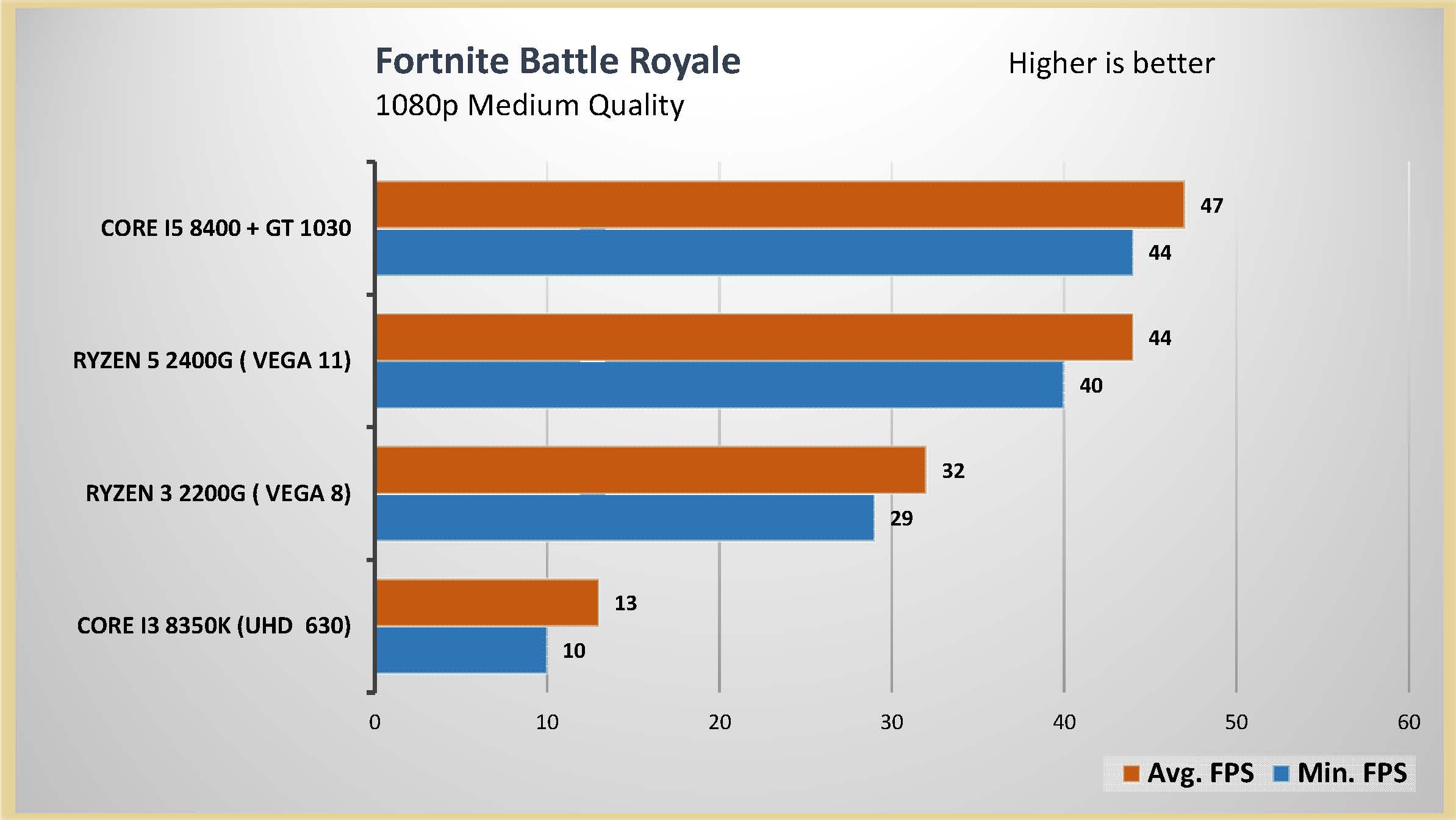 احتبرت المعالج الرسومى المدمج مع العديد من الالعاب على اعدادات متوسطة و اعدادات متقدمة على دقتين عرض مختلفتين 1080 و 720 لتقييم اداء المعالج الرسومى بشكل جيد و تم وضع البطاقة الرسومية GT 1030 فى المقارنة و ايضا المعالج الرسومى المدمج من انتل UHD 630 و هذه هى الفئة السعرية المقاربة للمعالجين Ryzrn 5 2400G و Ryzen 3 2200G و قد تكون اقل فى السعر اذا تم حساب سعر البطاقة الرسومية GT 1030