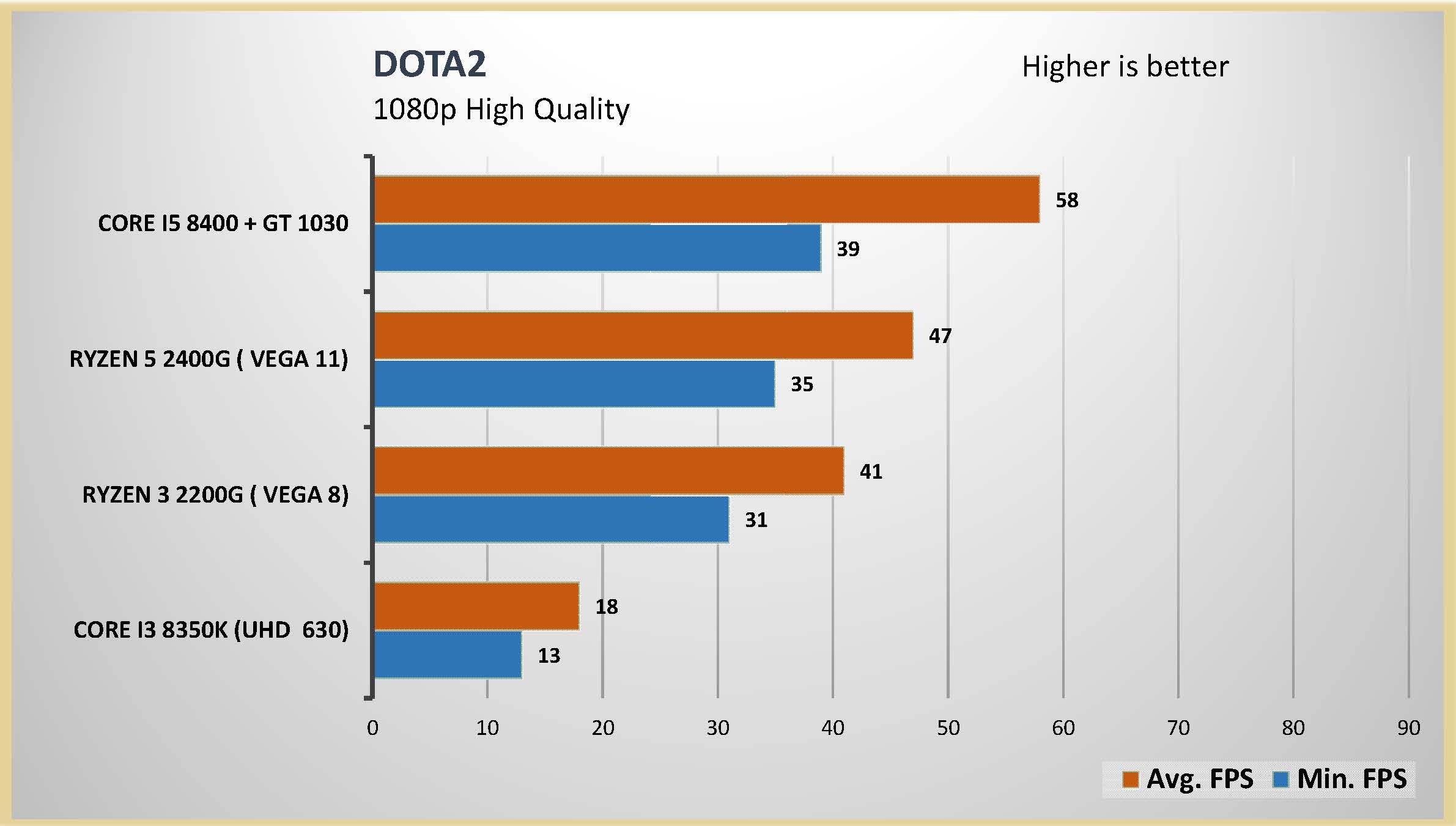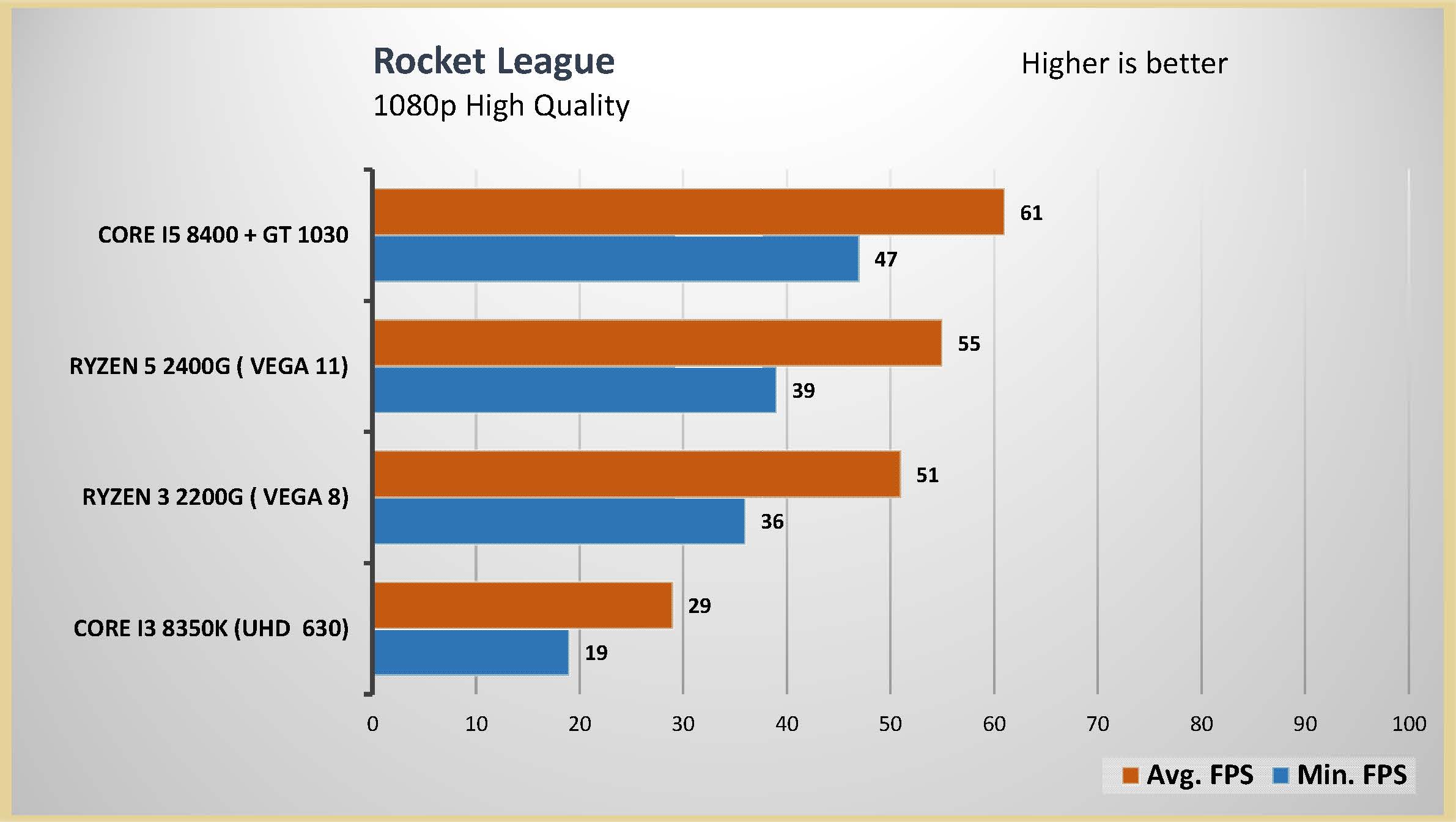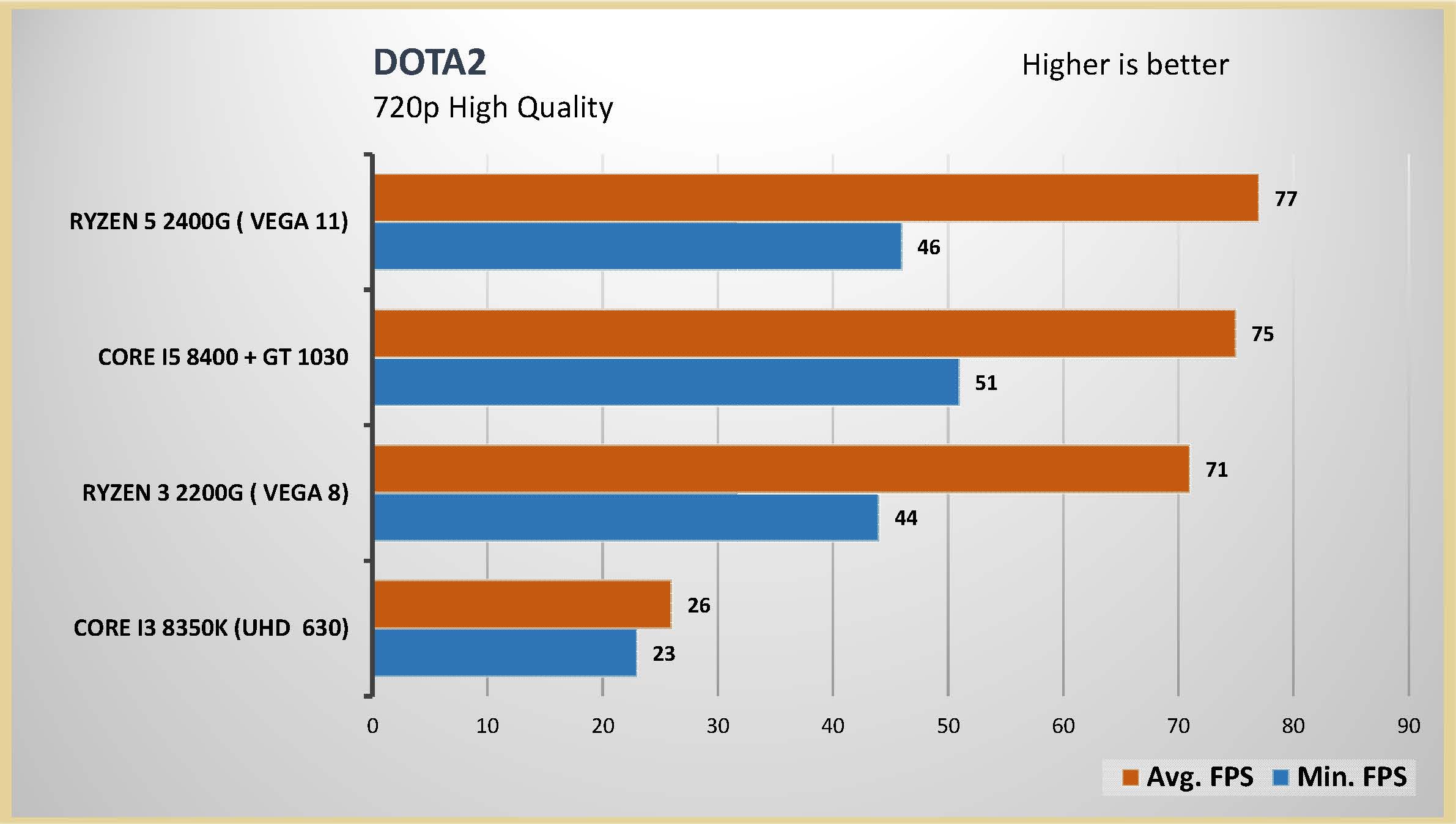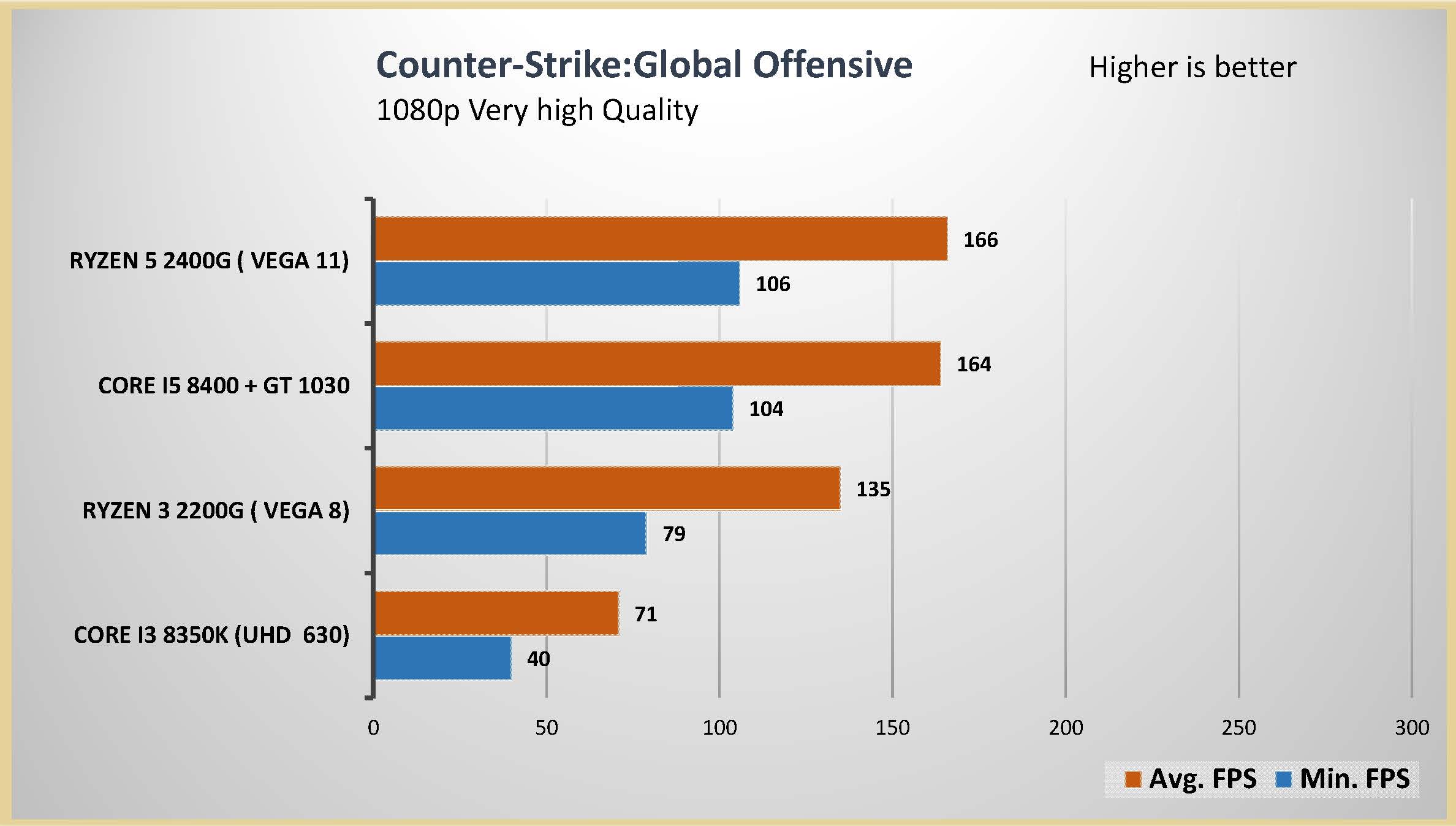 احتبرت المعالج الرسومى المدمج مع العديد من الالعاب على اعدادات متوسطة و اعدادات متقدمة على دقتين عرض مختلفتين 1080 و 720 لتقييم اداء المعالج الرسومى بشكل جيد و تم وضع البطاقة الرسومية GT 1030 فى المقارنة و ايضا المعالج الرسومى المدمج من انتل UHD 630 و هذه هى الفئة السعرية المقاربة للمعالجين Ryzrn 5 2400G و Ryzen 3 2200G و قد تكون اقل فى السعر اذا تم حساب سعر البطاقة الرسومية GT 1030