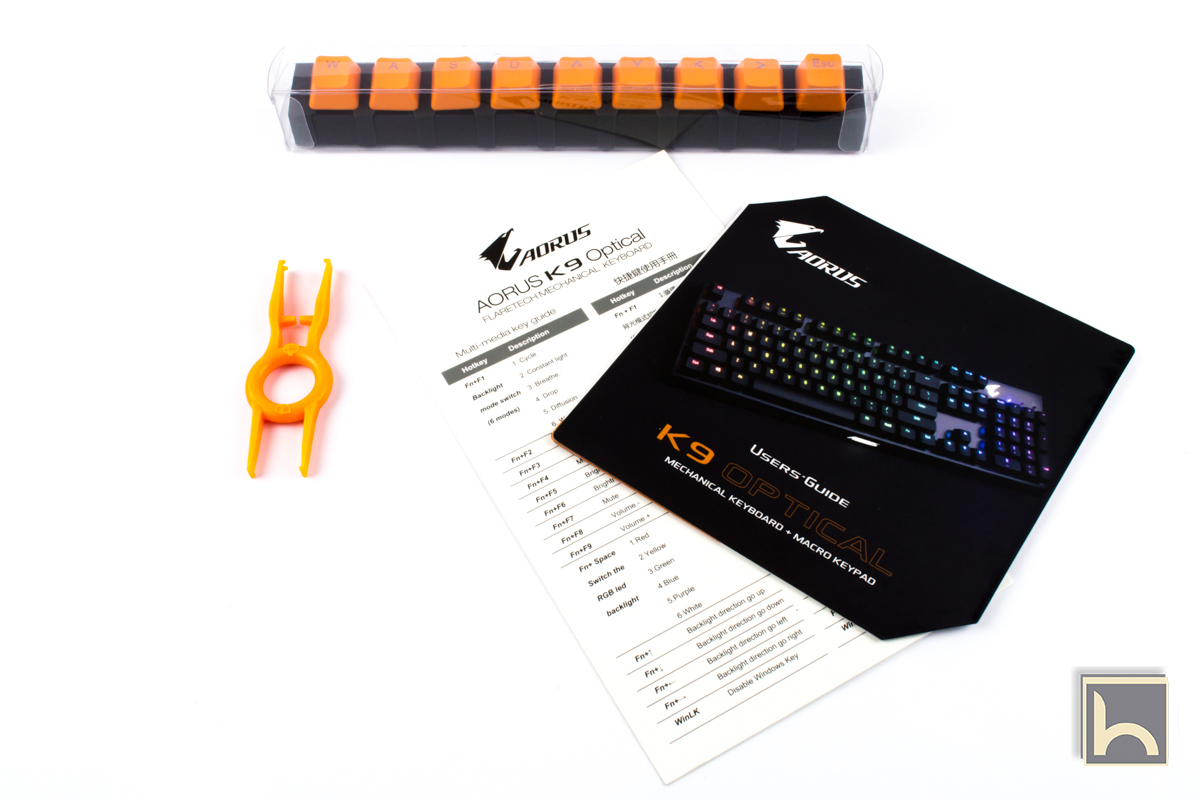 محتويات الصندوق بالاضافة الى لوحة المفاتيح Aorus K9 Optical كتيب تعليمات التشغيل و مجموعة مفاتيح اضافية اداة مزدوجة الاستخدام و مهذبة الطرفين تستخدم لازالة اغطية المفاتيح من طرف و الطرف الاخر لازالة السويتش نفسه و تعتمد gigabyte فى اضافة تلك الاداة على حماية اغطية المفاتيح من الخدش اثناء ازالتها للمستخدمين المبتدئين.