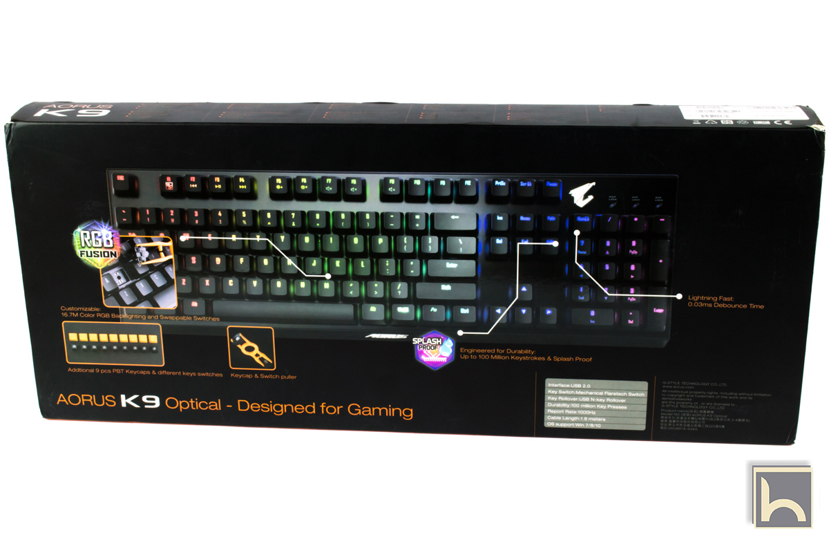 تأتى لوحة المفاتيح Aorus K9 Optical فى صندوق تغليف باللون الاسود من الورق المقوى مع طباعة الوان عالية الجودة و صورة بحجم كبير للوحة المفاتيح على واجهة الصندوق الامامية مع توضيح لبعض مميزات لوحة المفاتيح التى تعتمد على Switch من نوع Flaretech و هو ]اتى بنوعين الازرق و الاحمر و النسخة التى وصلتنا هنا هى بالنوع الازرق كما هو موضح على واجهة الصندوق الامامية.