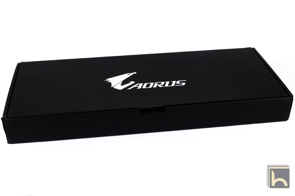 عند فتح صندوق لوحة المفاتيح وجدت انه غلاف خارجى فقط من الخارج من الكارتون الخفيف اما لوحة المفاتيح نفسها كانت فى صندوق اخر داخلى قوى مضاد لاى صدمات تحدث اثناء التنقل و هو باللون الاسود و فى المنتصف تجد شعار Aorus المميز