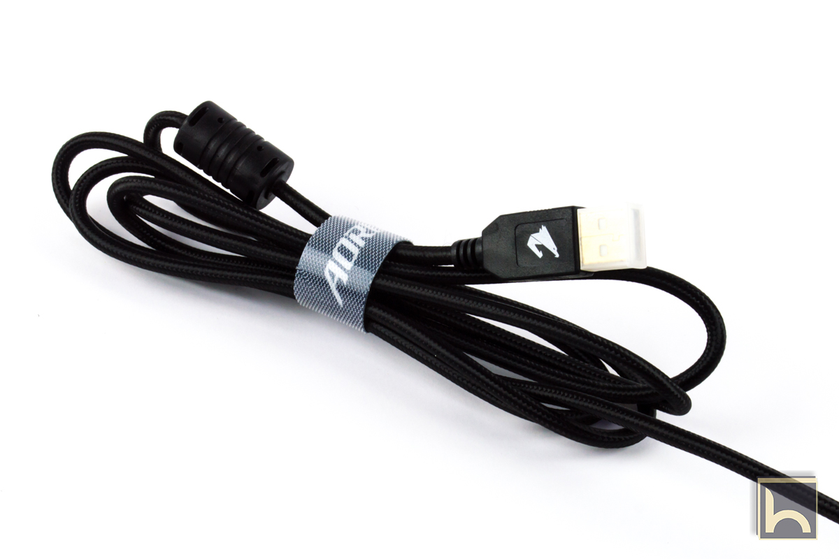 توصيل لوحة المفاتيح عن طريق كابل بطول 1.8 متر مغلف بطبقة من النايلون للحماية من التلف و لديه موصل USB عالى الجودة و يبدو الكابل سميك الى حد ما و يتميز بوجود شعار Aorus على الموصل و ايضا جزام Aorus الذى يمكنك من تثبيت الكابلات معا حتى لا تتشابك مع كابلات اخرى خصوصا ان كنت تستخدم ماوس من Aorus فقد يبدو الامر مميز حينها.