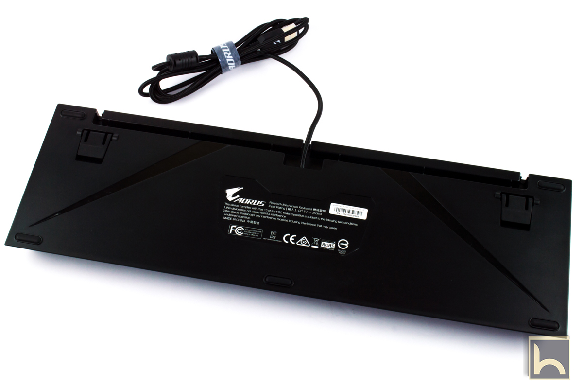 يحتوى الجزء الخلفى من لوحة المفاتيح Aorus K9 Optical على فراغات تشبه الممرات لتمرير كابل توصيل لوحة المفاتيح بحيث يمكن تمريرها من اى جانب من الاجناب او المنتصف حتى تكون قريبة من جهاز الالعاب الخاص بك و تحافظ على الشكل الجمالى لمكتبك بالاضافة الى ذلك ترتكز لوحة المفاتيح على خمسة ارجل مطاطية متباعدة بشكل متساوى لضبط الارتفاع عن سطح المكتب.