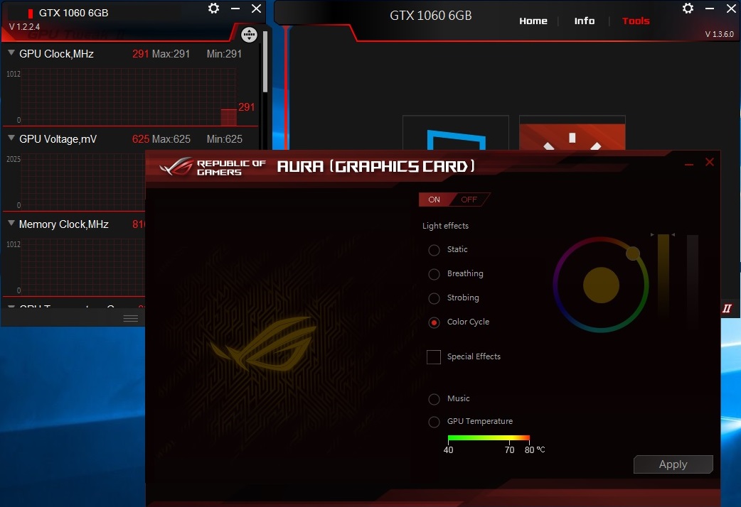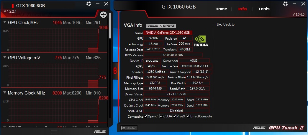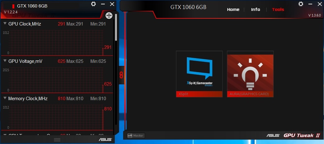 برنامج ASUS GPU Tweak الحصرى لدى ASUS الخاص بالبطاقات الرسومية و يستخدم البرنامج لمراقبة البطاقة من حيث التردد و الحرارة و الاستخدام العام للبطاقة وبخلاف المُراقبة فالبرنامج يُمكن المُستخدم من تغير الاعدادات الخاصة بالبطاقة مثل رفع ترددات التشغيل و تغيير سرعة المراوح بالاضافة لذلك فانه يتيح للمستخدم الاختيار سواء بتفعيل او عدم تفعيل خاصية 0dB Fan و و ايضا يمكن التحكم فى نظام الاضاءة AURA و الوانها و تمتاز واجهة البرنامج باللون الاحمر و الاسود و هى الالوان التى تستخدم فى تصميمات منتجات سلسلة STRIX وتم استخدام البرنامج فى رفع تردد التشغيل الخاص ببطاقة GTX 1060 Strix