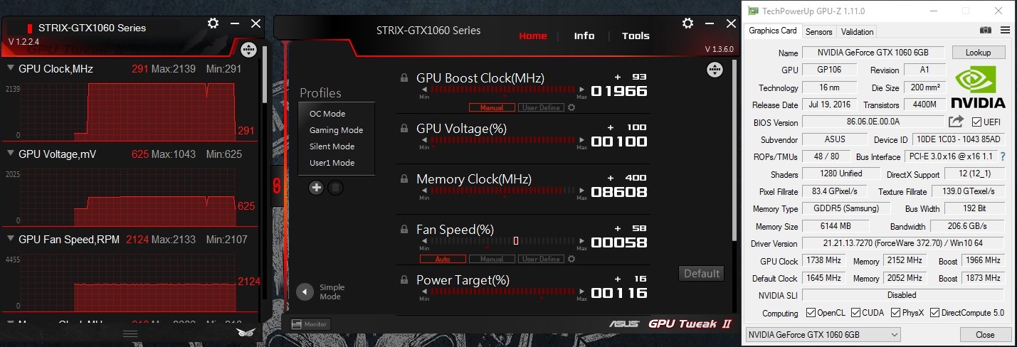 رغم ان البطاقة GTX 1060 Strix تأتى بتردد اعلى من التردد القياسى فالبطاقة تاتى بتردد 1620MHz يصل الى 1847MHz عن طريق خاصية Boost على الوضع الافتراضى Gaming Mode و ايضا التردد على الوضع OC Mode هو 1645MHz يصل الى 1873MHz الا ان ASUS قد وضعت لنا الخيارات اللازمة لرفع تردد التشغيل مع مكونات عالية الجودة فهوس رفع تردد التشغيل مُستمر عند مُستخدمى القطع الاحترافية وخصوصا مُحبى الالعاب ونحن منهم و كان يجب ان نتعرف على قدرة البطاقة فى رفع تردد التشغيل و الثبات وما هى الفروقات التى قد نحصل عليها بعد رفع تردد التشغيل فقد قمت برفع تردد البطاقة بزيادة 118MHz لتردد النواة والوصول الى تردد 1738 MHz وفى وضعية البوست يصل تردد البطاقة الى 1966 بزيادة اضافية تلقائياً من البطاقة بمقدار 228MHz مع رفع الفولت بزيادة 50+ ورفع تردد الذاكرة الى 2152MHz بزيادة 100MHz ويعتبر الامر جيد بالنسبة للبطاقة GTX 1060 Strix اما عن الحرارة فهو امر مفرح للغاية ان نجد ان درجات الحرارة لم ترتفع بقيمة كبيرة رغم زيادة فولت المعالج الرسومى وهذا يرجع الى التبريد المُستخدم مع البطاقة GTX 1060 Strix فبعض البطاقات الاخرى يمكن ان يرتفع تردد التشغيل بها لاكثر من ذلك لكن تكون هذه الزيادة على حساب درجات الحرارة لكن ASUS تريد ان يزيد العمر الافتراضى لمنتجاتها فقد وضعت حدود لرفع تردد التشغيل بحد اقصى للفولت و هو ما وصلنا لها فى المعالج الرسومى و الذاكرة.