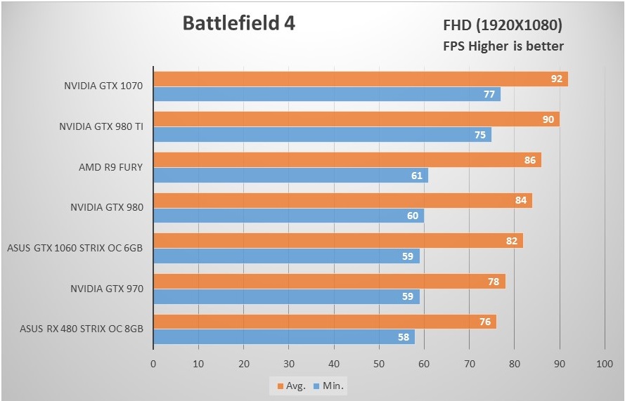 عند الاختبارات التى تتم على البطاقات الرسومية نجد لعبة حاضرة دائمة فى هذه الاختبارات Battlefield 4 فتعتبر من اشهر الالعاب القتالية و التى يتم قياس رضاء المستخدم عن البطاقات من خلالها فهى من أكبر الألعاب التى صدرت فى العام المُنقضى و هى لعبة مُغامرات قِتالية و تَستخدم مُحرك رسومى Frostbite 3 وهذا المُحرك يُتيح لنا بيئات واقعية اكثر مع مؤثرات مُجسمة عالية الدقة .
