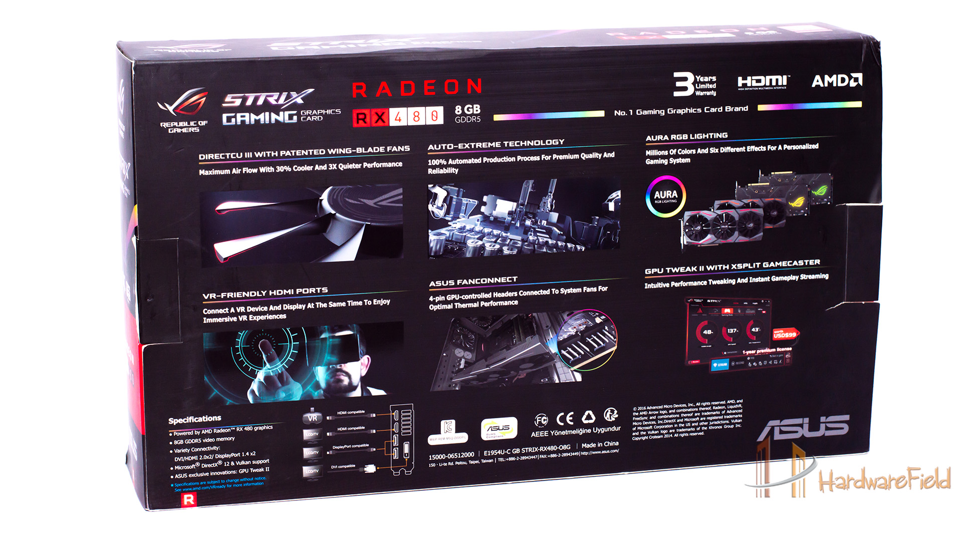 كل المعلومات الخاصة بالبطاقة تظهر على خلفية الصندوق التى توضح بعض التقنيات التى وضعتها ASUS على هذه البطاقة فمنها معلومات عن مراوح التبريد و دوائر الطاقة و نظام الاضاءة الجديد AURA .