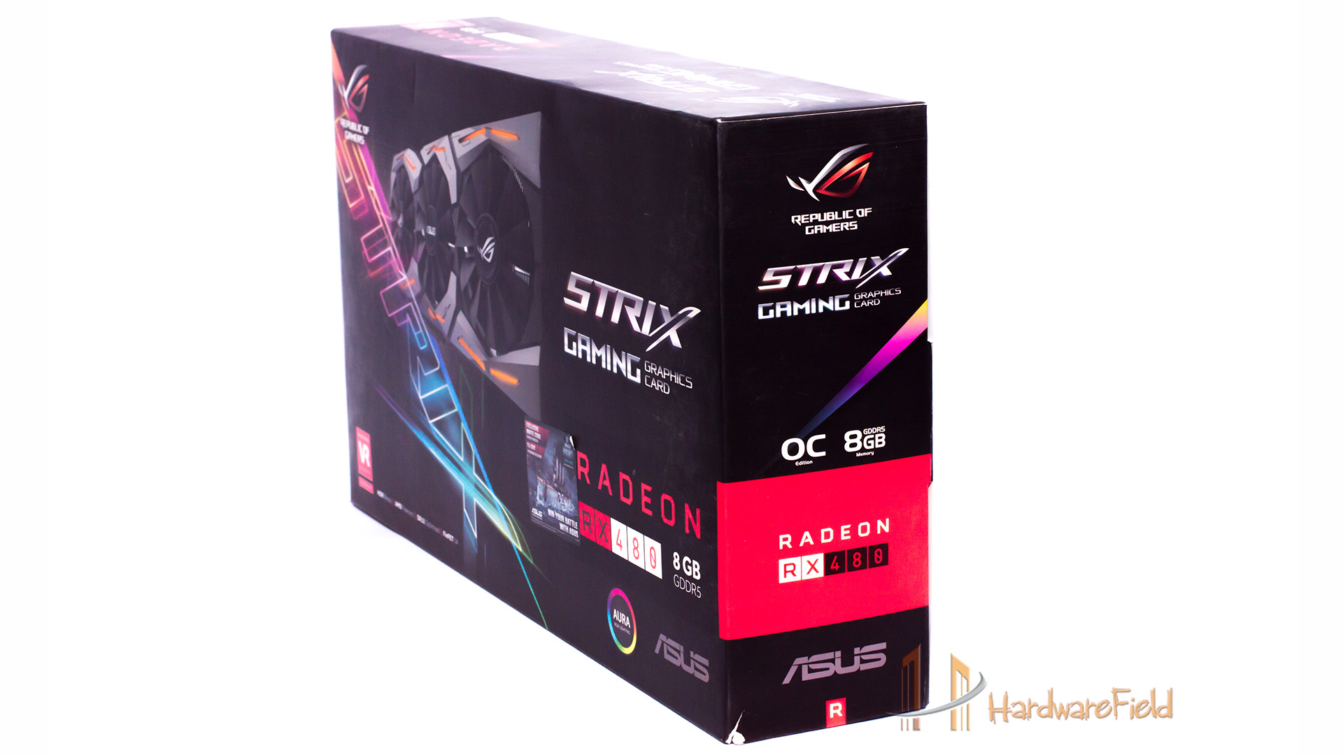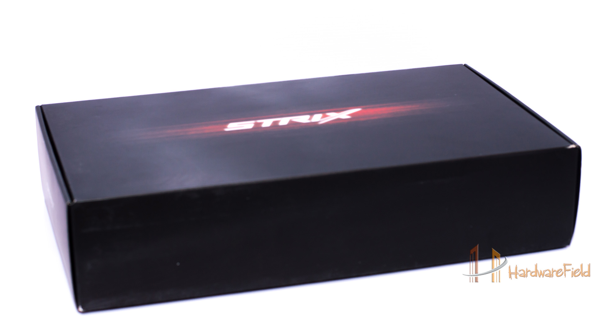 صندوق البطاقة من الأمام ويَختلف عن الصناديق السابقة من شركة Asus فقد تم إستخدام شكل طائر البوم من قبل على صناديق البطاقات من فئة Strix اما الان فقد عادت Asus لوضع صورة للبطاقة و بجانبها كلمة Strix بعدة الوان فى اشارة الى نظام الاضاءة RGB الجديد و الذى اصبح يستخدم فى اغلب قطع الحاسوب الحديثة.