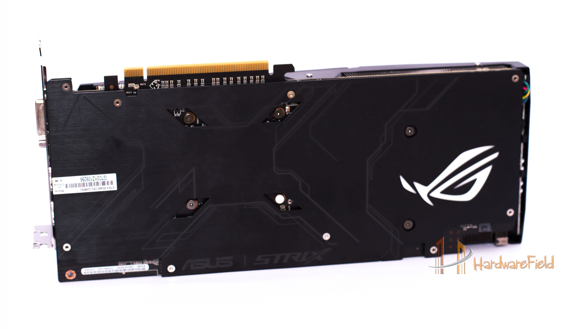 البطاقة من الخلف محمية بدرع معدنى يقوم بدوره بحماية لوحة الداوئر من اى صدمات اثناء التركيب او ايضا ليساعد فى تبريدها و يختلف عن البطاقات GTX 1060 و GTX 1070 بوجود شعار ROG عليه من الخلف و يضىء مع نظام الاضاءة AURA.