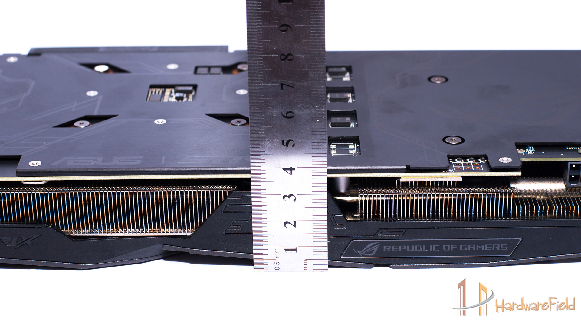 بعد فك اجزاء البطاقة للتعرف على مكونات لوحة الدوائر و مكونات التبريد امامكم صورة لتبريد البطاقة المكون من حمسة من الانابيب الحرارية الملامسة مباشرة لنواة المعالج الرسومى و تقوم هذه الانابيب بنقل الحرارة الى مجموعة من الزعانف الالومنيوم المتراصة بجوار بعضها و تقوم المراوح بدورها بتشتيت هذه الحرارة بعيدا عن البطاقة و يسمى هذا التبريد DirectCU III الحصرى لدى ASUS و يزيد كفاءة تبريد البطاقة بنسبة 30% عن النسخ القياسية.