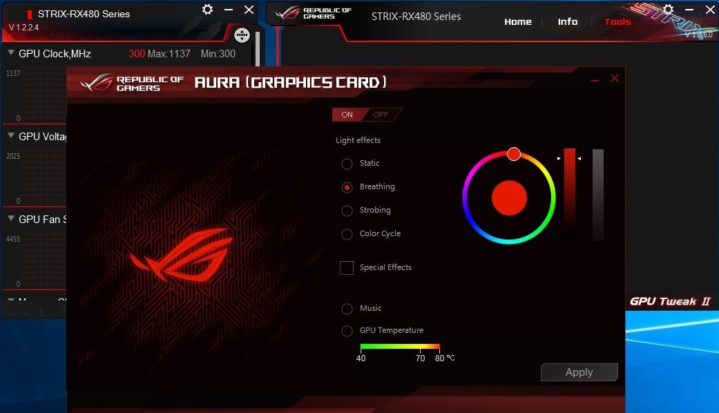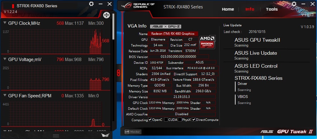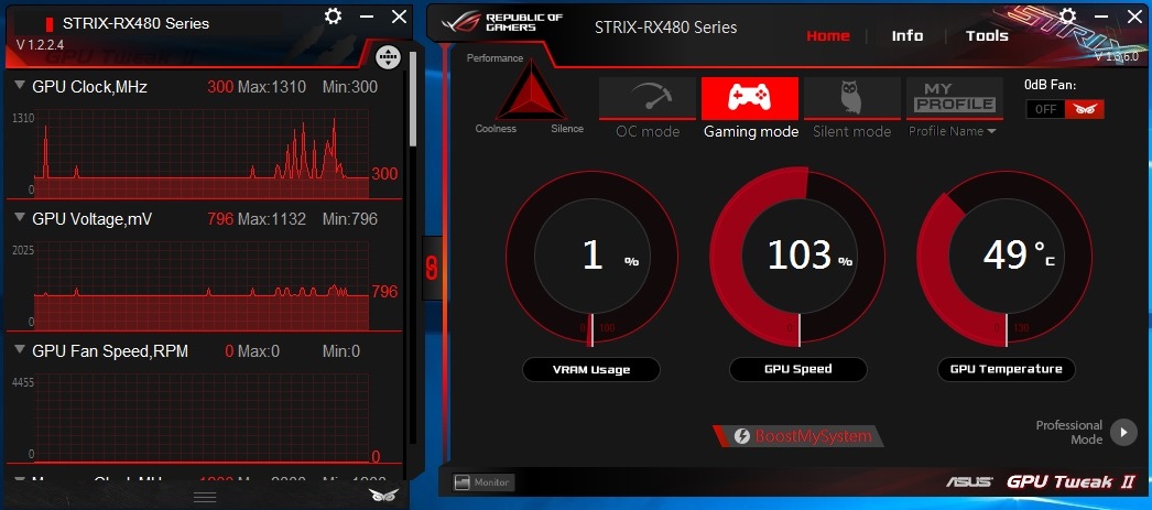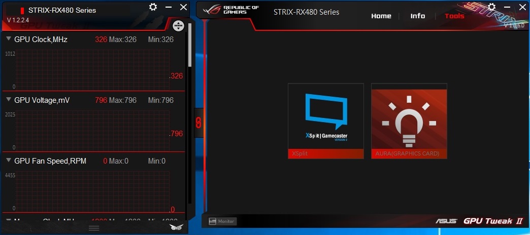 برنامج ASUS GPU Tweak الحصرى لدى ASUS الخاص بالبطاقات الرسومية و يستخدم البرنامج لمراقبة البطاقة من حيث التردد و الحرارة و الاستخدام العام للبطاقة وبخلاف المُراقبة فالبرنامج يُمكن المُستخدم من تغير الاعدادات الخاصة بالبطاقة مثل رفع ترددات التشغيل و تغيير سرعة المراوح بالاضافة لذلك فانه يتيح للمستخدم الاختيار سواء بتفعيل او عدم تفعيل خاصية 0dB Fan و و ايضا يمكن التحكم فى نظام الاضاءة AURA و الوانها و تمتاز واجهة البرنامج باللون الاحمر و الاسود و هى الالوان التى تستخدم فى تصميمات منتجات سلسلة STRIX وتم استخدام البرنامج فى رفع تردد التشغيل الخاص ببطاقة RX 480 Strix