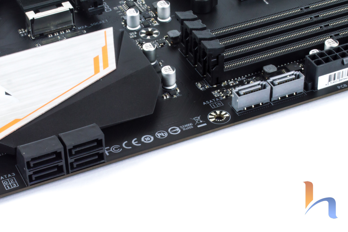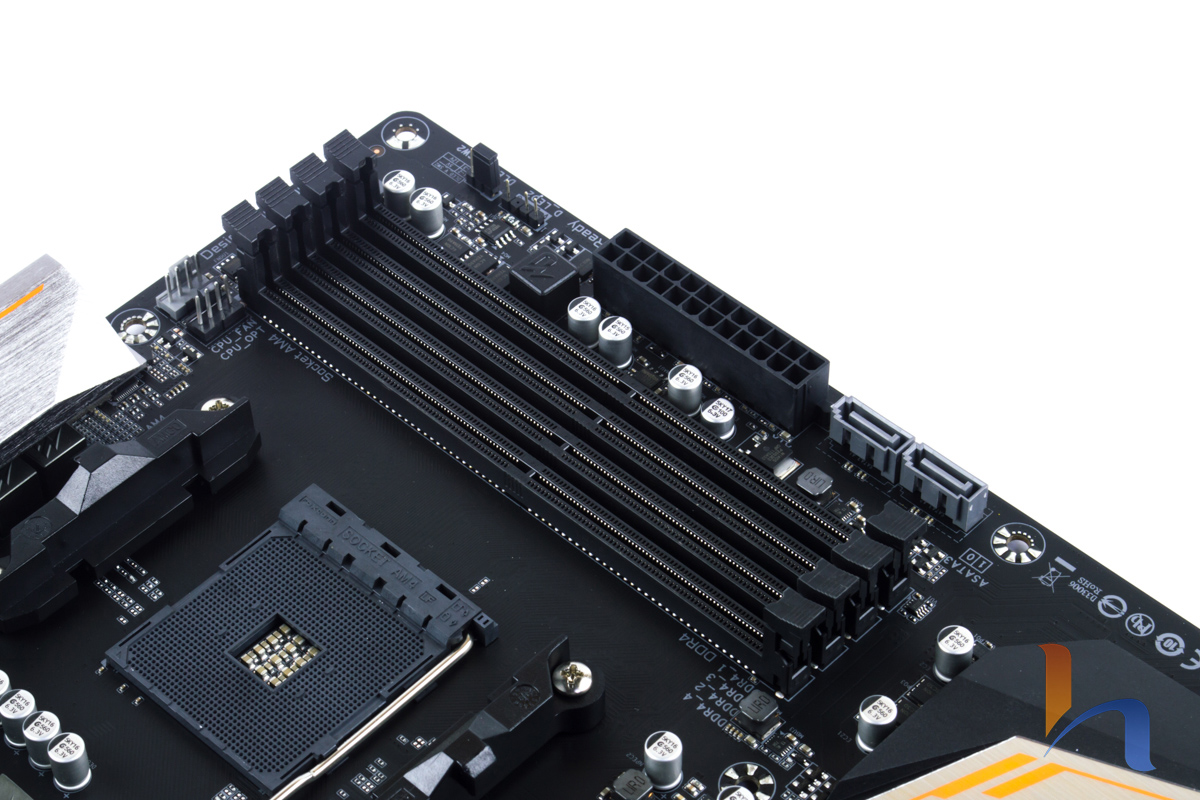 هنا ترى اربعة شقوق DIMM لتثبيت شرائح الذاكرة المذدوجة القنوات و تتحمل اللوحة شرائحة ذاكرة بسعة تصل الى 64 جيجا اما عن السرعات التى تقبلها اللوحة فهى تدعم حتى 3200 MHz مكسورة السرعة مع معالجات Ryzen الجيل الاول اما الجيل الثانى فيمكنها تحمل حتى 3466 MHz و يرجى التحقق من الذاكرة المتوافقة ومن QVL على موقع جيجابايت