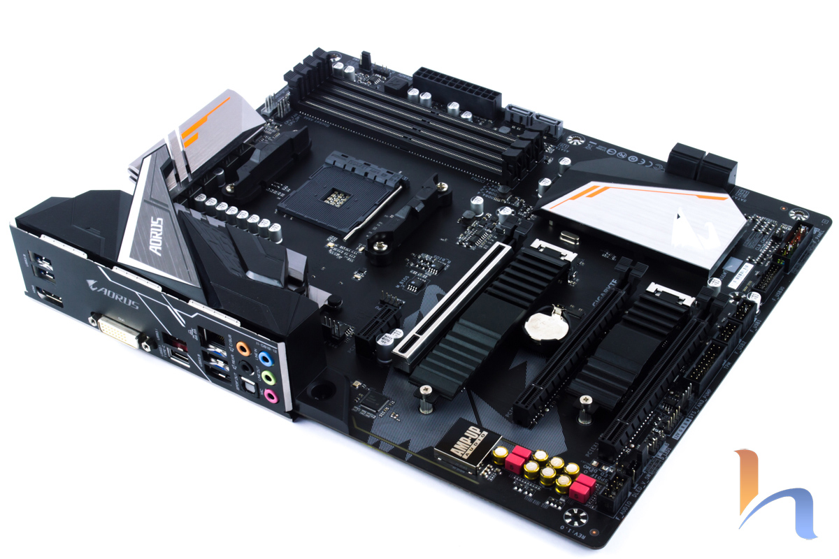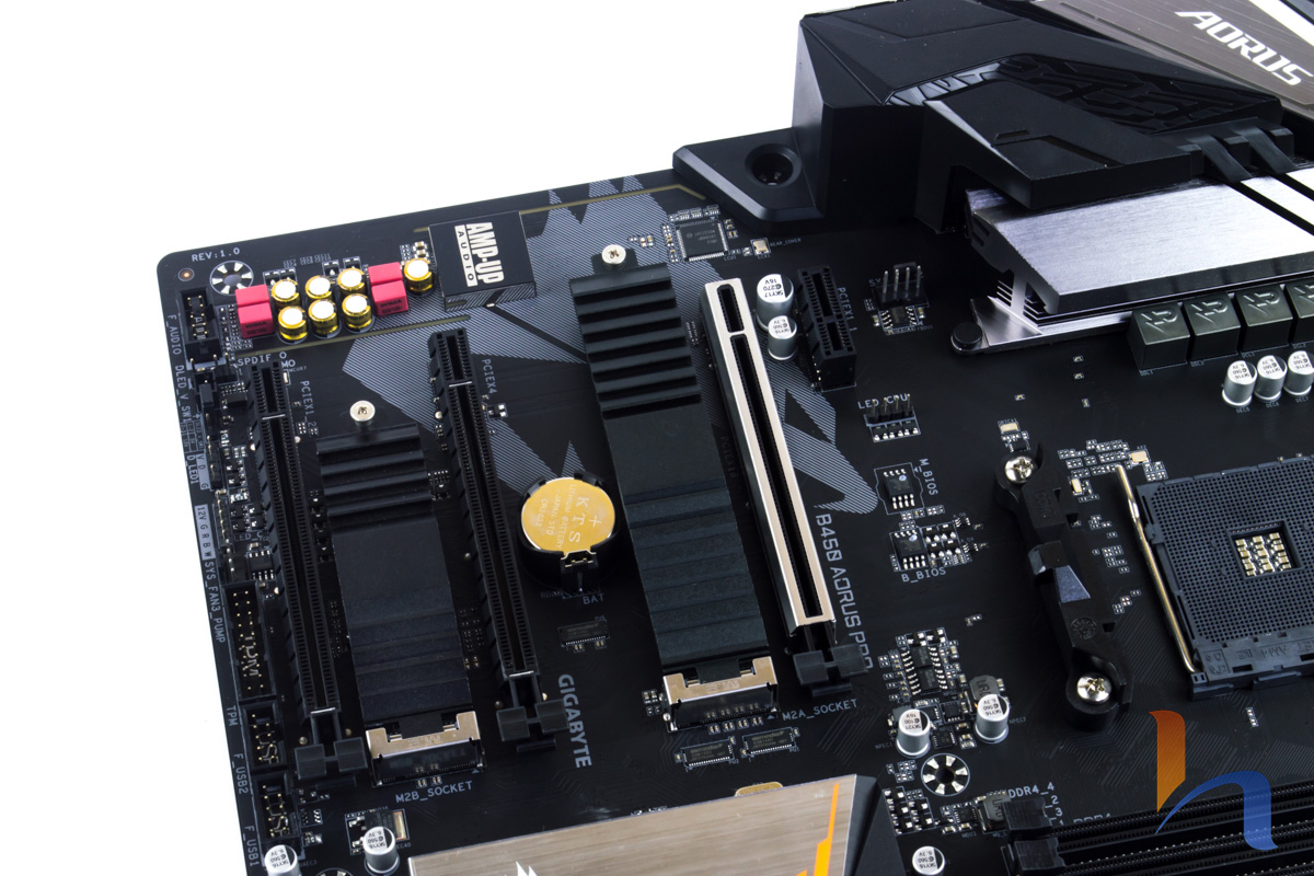 و هنا تظهر اللوحة B450 Aorus Pro بشكل مميز و لا تختلف كثيرا عن لوحات الفئة الاعلى X470 او حتى X370 كما واضح فهى تمتلك مشتتات بحجم كبير لتبريد دوائر الطاقة الخاصة بالمعالج و مشتت كبير الحجم ايضا لتبريد شريحة B450 فلم نعتاد على هذا فى لوحات الفئة الاقتصادية و فى باقى صفحات المقالة سنتعرف اكثر على اللوحة بشكل تفصيلى