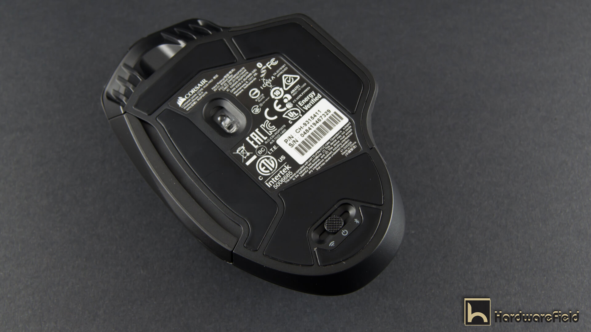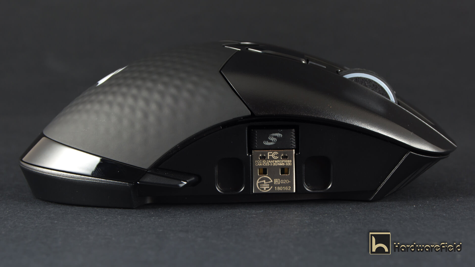 لن تتركك Corsair أن تفقد اداة التوصيل اللاسلكى فى حالة أن كنت تستخدم الأتصال عن طريق الكابل ففى الجانب الايمن القابل للتعديل يوجد تجويف على نفس شكل قطعة الاتصال اللاسلكى و لا يسمح تصميم ماوس الالعاب DARK CORE RGB PRO بتغيير الأوزان