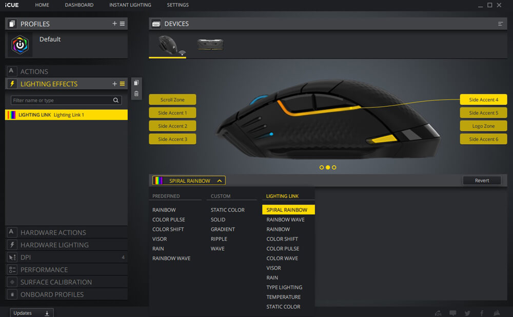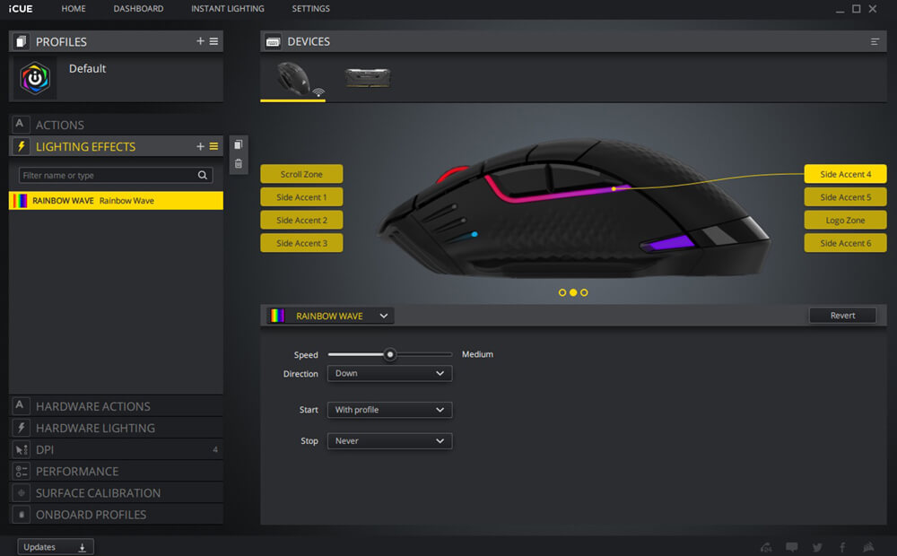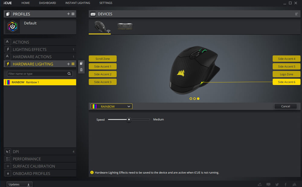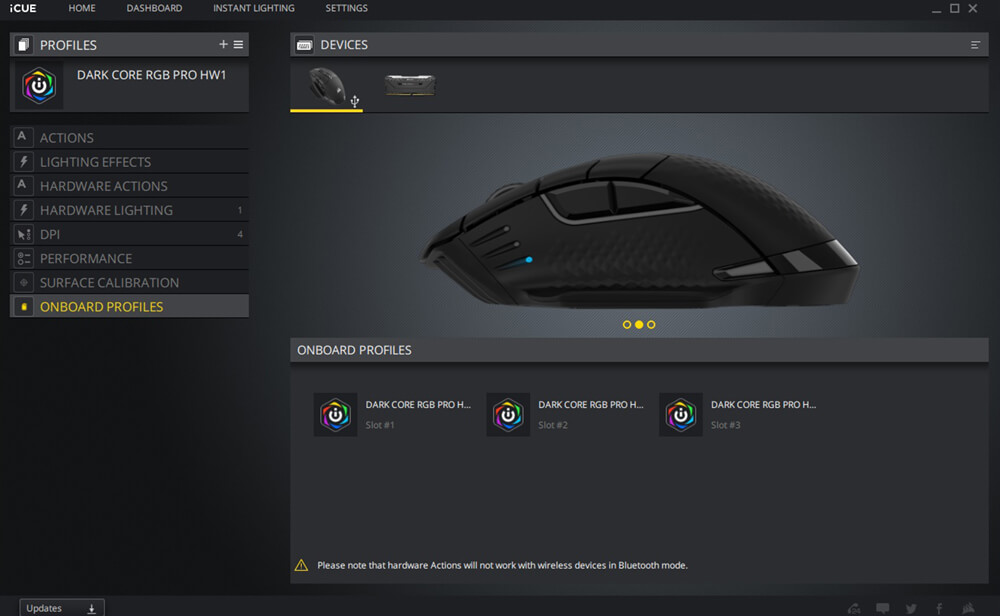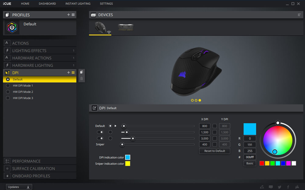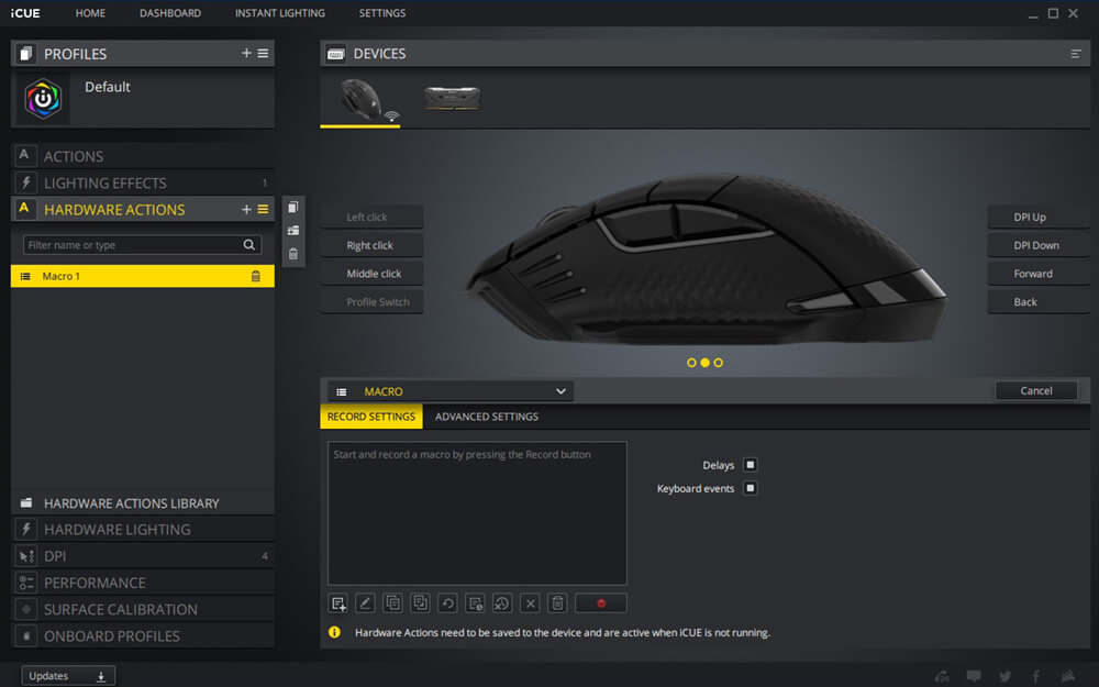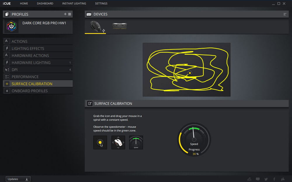 يمكن أن تتضمن الأعدادات تعيين وحدات الماكرو و التحكم فى الوسائط و الاختصارات و اضافة ملفات تعريف اضافية للماوس بخلاف ثلاثة ملفات تعريف محفوظة مسبقة على شريحة الذاكرة الخاصة بالماوس و يمكن اعادة تعيين الازرار لمفاتيح معينة و مهام مخصصة طبقا لرغبتك و ستجد ايضا اعدادات التحكم فى الأضاءة و اختيار درجات الألوان و السطوع و نقاط تضىء بألوان محددة و يمكن الاستعانة بملفات اعدادات اضاءة جاهزة مسبقا محفوظة على تطبيق iCUE و يسمح ايضا التطبيق بمزامنة اضاءة الماوس مع قطع أخرى من Corsair متصلة بجهازك و يوجد قائمة أخرى لتعيين أزرار التحكم فى مستوى سرعة مؤشر الماوس DPI و يليها قائمة التحكم فى الاداء حيث يمكن ضبط سرعة المؤشر و الزاوية و يمكن أن يستخدم الماوس DARK CORE RGB PRO أداة معايرة Surface iCUE جودة السطح الذى تضع عليه الماوس اثناء جلسات الألعاب و ضبط المستشعر وفقا لذلك