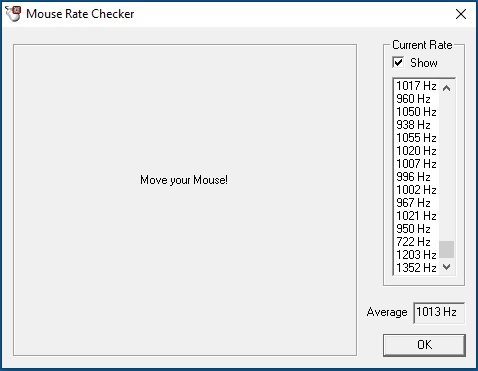 و لدينا أختبار للتحقق من معدل سرعة الماوس و يظهر أن الماوس يعطى معدل يفوق 1000 هرتز و يبقى قريبا من القيمة التى تعلنها الشركة