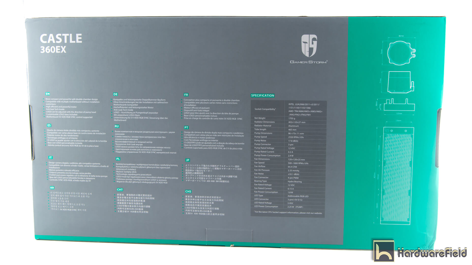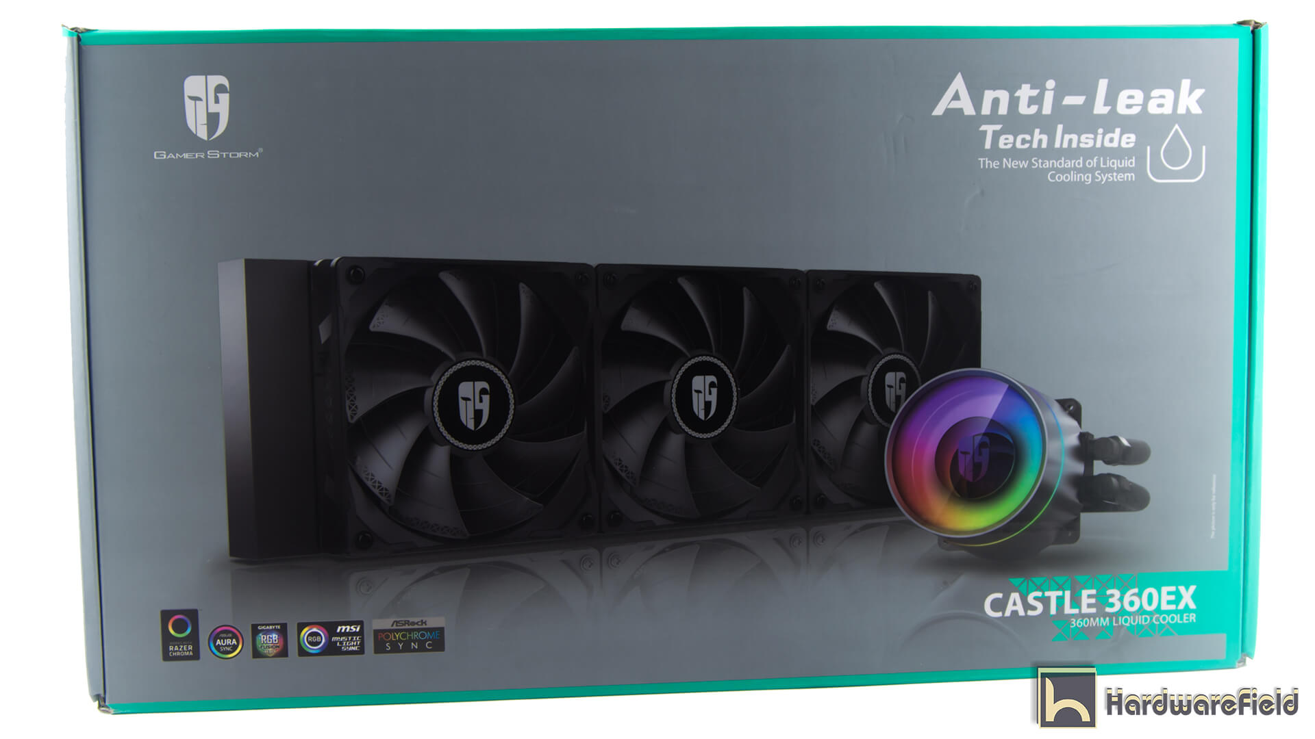 تغليف قوى بتصميم تقليدى يحتوى على صورة امامية كبيرة للمبرد Castle 360EX على خلفية رمادية و باقى جوانب الصندوق باللون الاخضر مع ملاحظة ان المبرد DeepCool Gamerstorm Castle 360EX متوافق مع تطبيقات التحكم فى الأضاءة RGB الخاصة باللوحات الرئيسية من الشركات الخمس الكبرى فى صناعة اللوحات الرئيسية كما هو مدون على الصندوق من الاسفل جهة اليسار