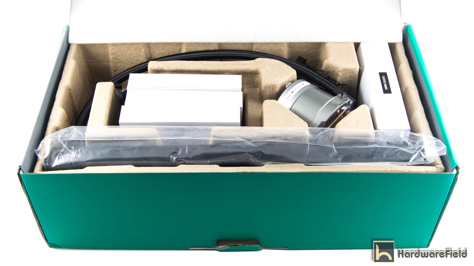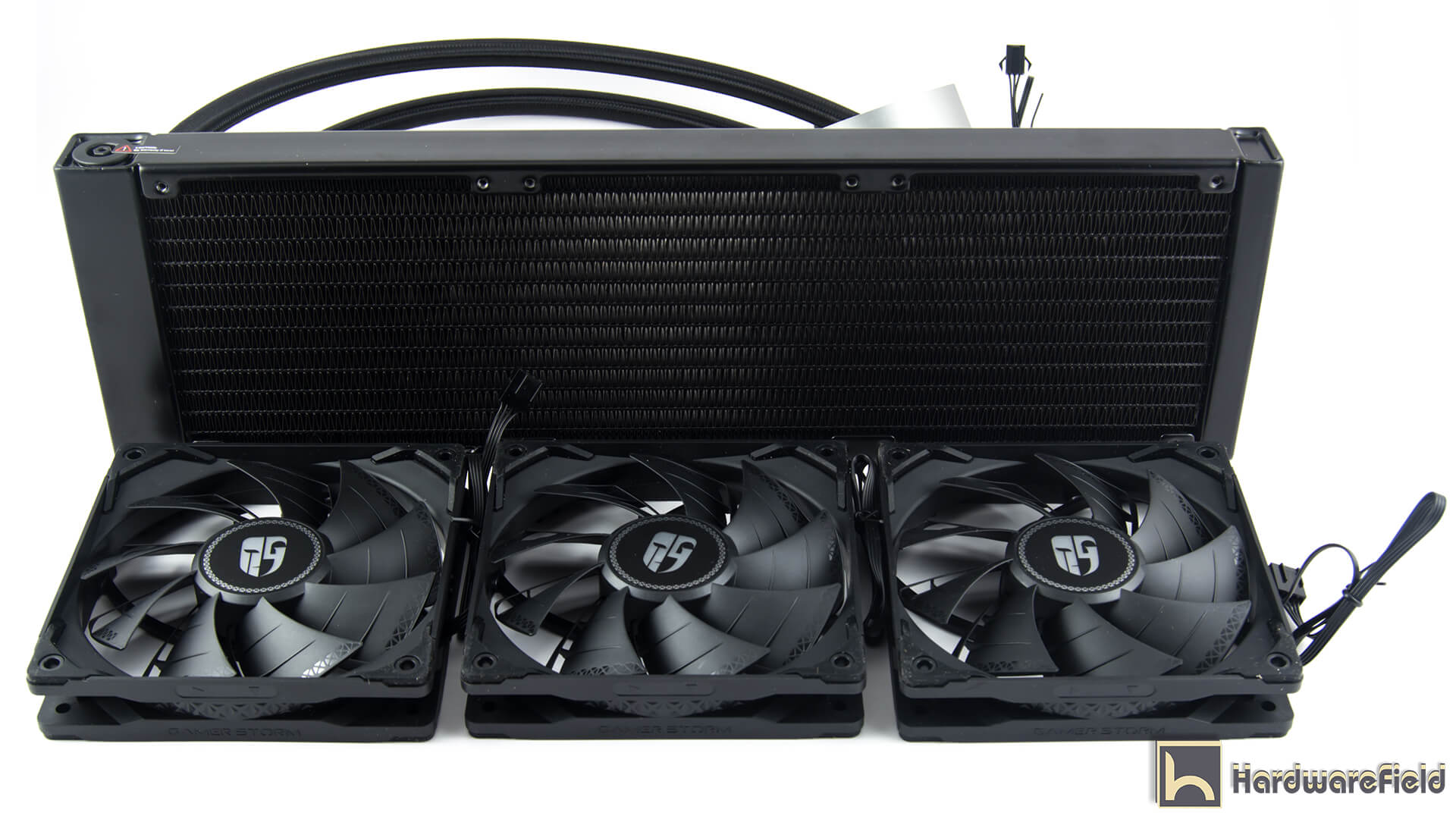بعد أخراج المبرد من الصندوق ترى رادياتير بطول 360 مم مصقل بشرائح من الالومنيوم يتخللها انابيب ليمر بينها السائل و يتم تبريده طبعا بعد تثبيت المراوح المرفقة مع المبرد TF120 التى تصل سرعتها الى 1800 لفة فى الدقيقة بمعدل ضغط هواء يصل الى 2.33mmaq و تنتج كمية هواء تقر ب 64.4 CFM و هى تأتى باللون الأسود و لا تتضمن اى اضاءة RGB و تكون الأضاءة فقط أعلى المضخة و تنتج DeepCool أصدار أخر يحتوى على مراوح بأضاءة RGB