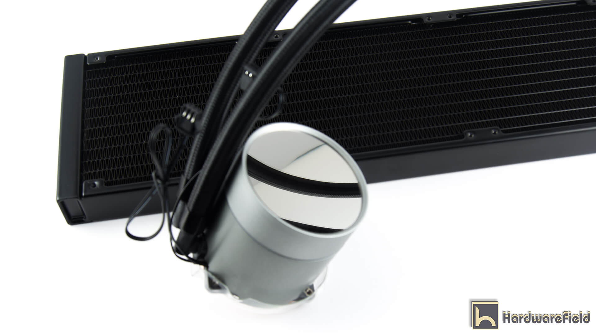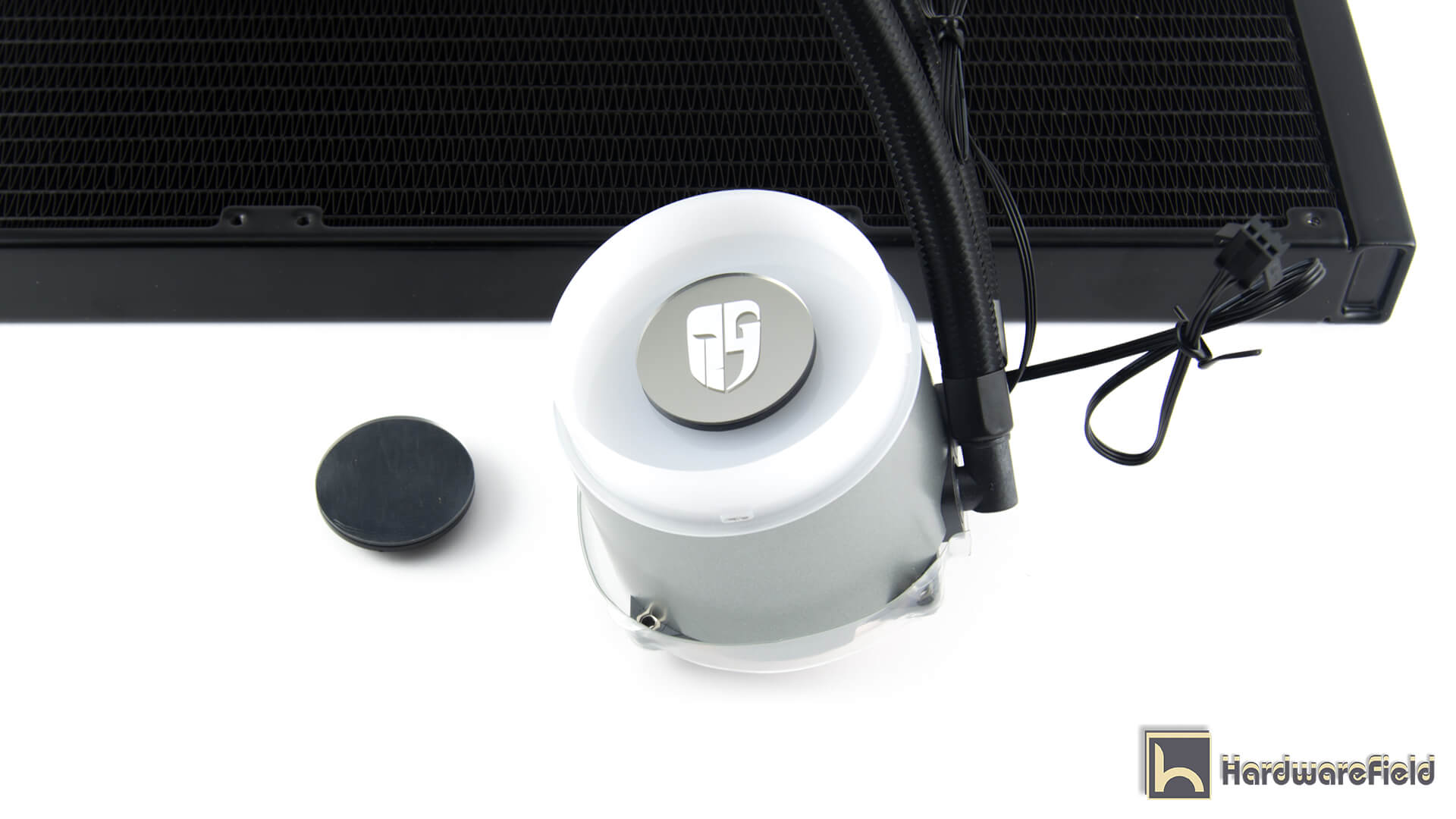 المضخة تأتى بشكل أسطوانى بتصميم مرتفع و بقطر كبير و تأتى بأضافة داخلية RGB من الجزء العلوى و توجد حلقة RGB فى المنتصف الخارجى