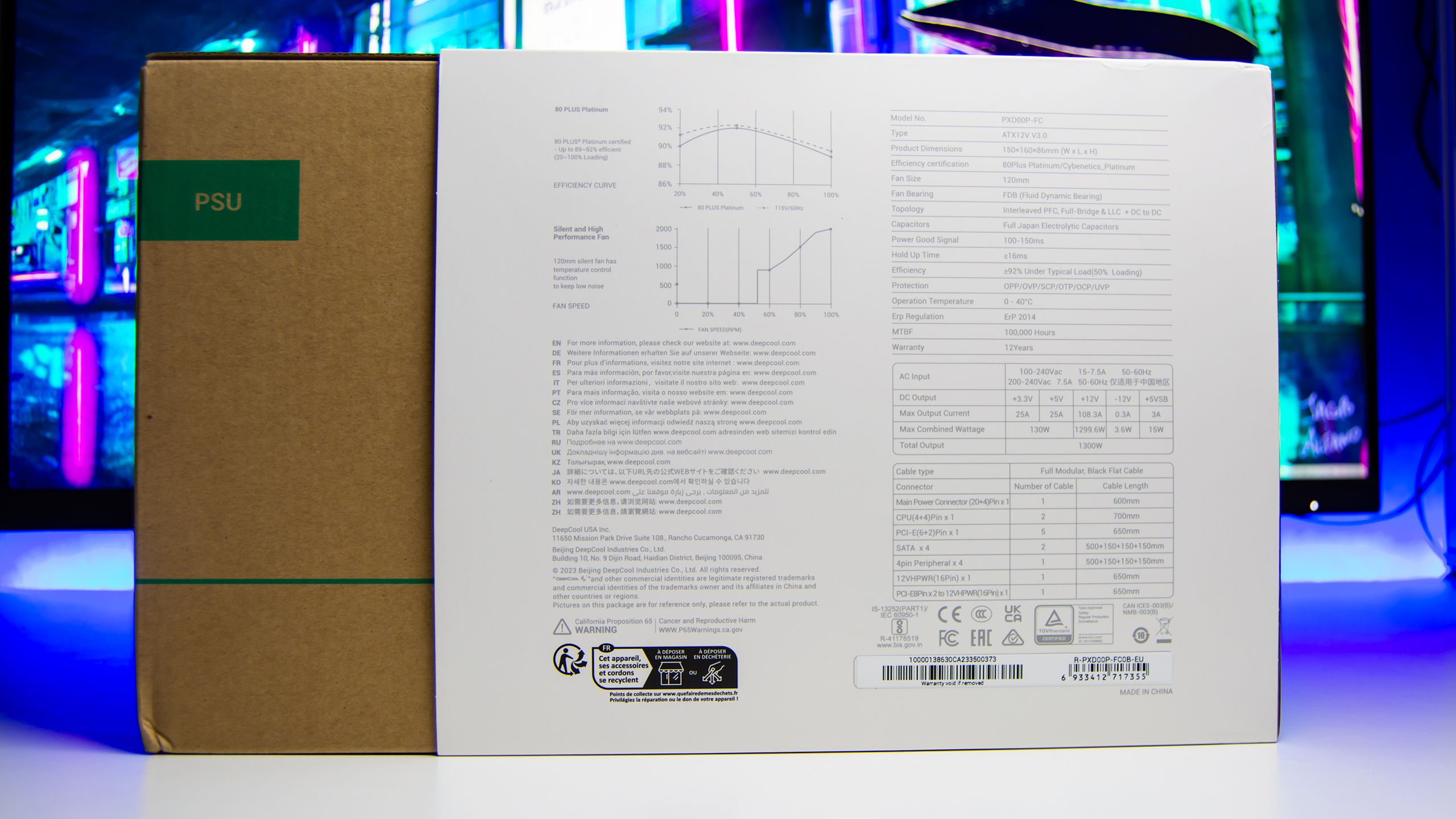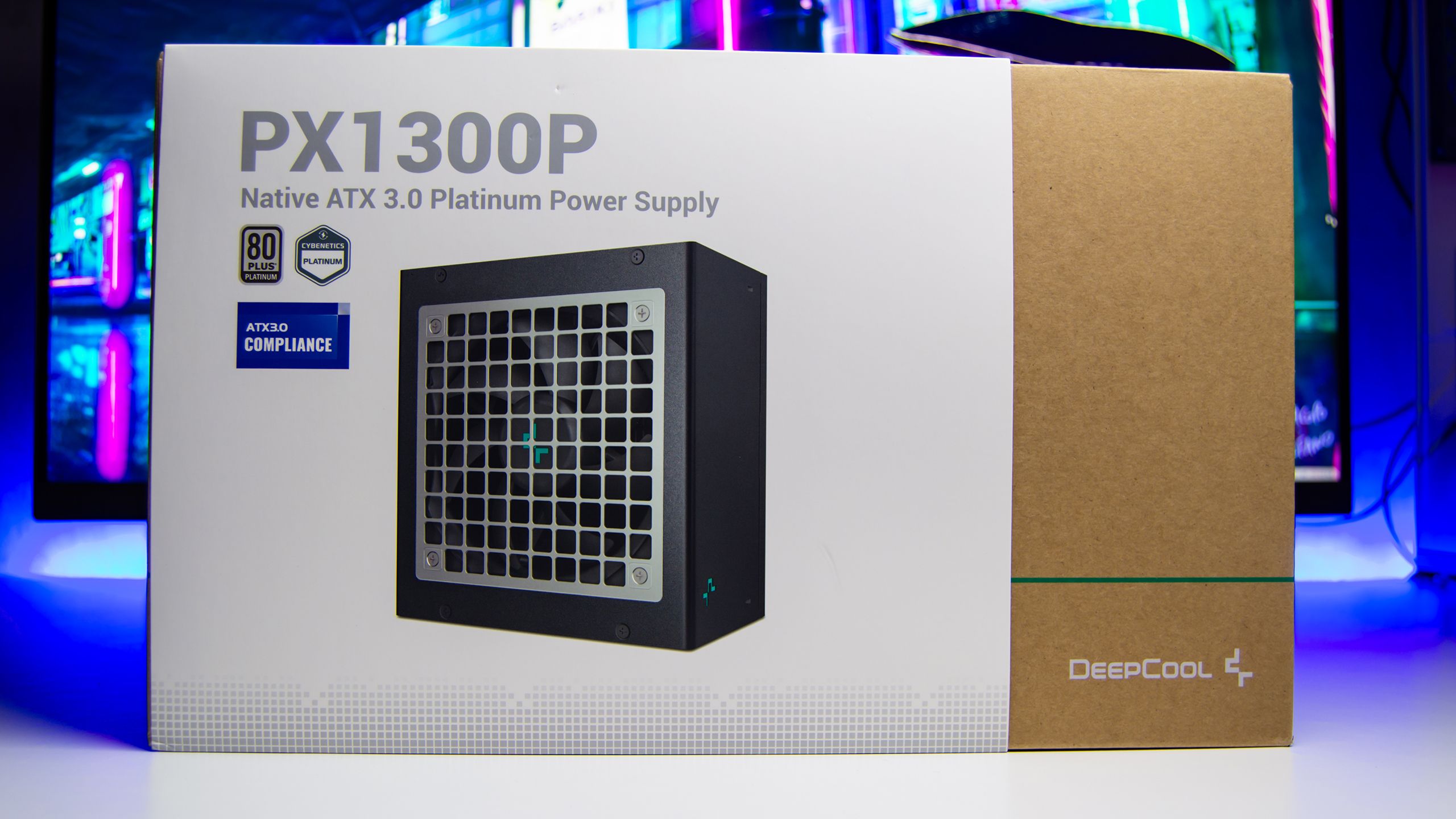 بنفس تغليف منتجات DeepCool يأتى مزود الطاقة PX1300P فى صندوق كبير الحجم من الورق المقوى مع غلاف خارجى باللون الأبيض يحمل صورة واضحة لمزود الطاقة مع معلومات واضحة تشير الى الشهادة البلاتينية التى يأتى بها مزود الطاقة PX1300P و دعم كامل لمقبس ATX 3.0