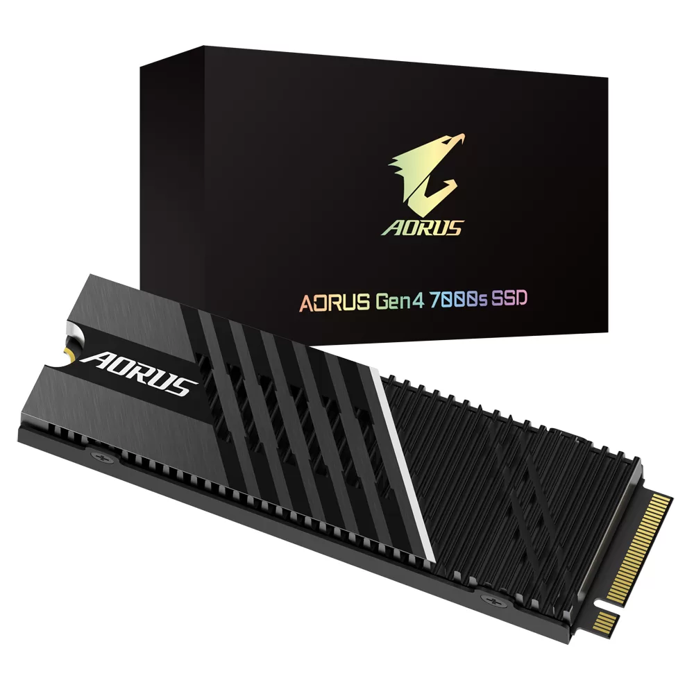 AORUS Gen4 7000sوحدة Aorus Gen4 7000s هى محرك تشغيل عالى الأداء يأتى بسعة تخزين 1 تيرابايت و 2 تيرابايت يستطيع الوصول الى سرعة قراءة 7000 7000 ميجابايت / ثانية و سرعة كتابة تصل الى 6850 ميجابايت / ثانية مع نسخة 2 تيرابايت و تعتمد على وحدة تحكم Phison E18 ذات 8 قنوات مع شرائح ذاكرة وميضة Nand Flash من نوع Micron B27B 96-Layer 3D TLC و لحماية أداء وحدة التشغيل من الأختناق تستخدم Gigabyte خافضات حرارة بحجم كبير مثلما كان الحال فى اصدارهم الاول لكن خافضات الحرارة هذه المرة ليست تقليدية فهى تأتى مطلية بطلاء من مادة النانو كاربون الذى يقال انه يساعد فى خفض درجات الحرارة بنسبة 20%