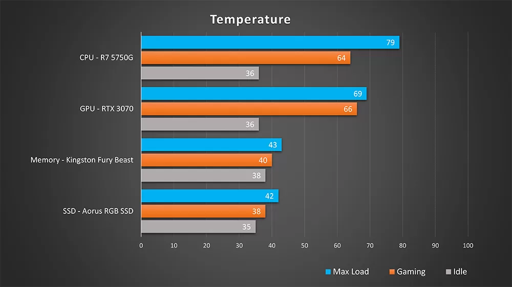 مرت التجميعة بأختبار درجات الحرارة فى الخمول و الألعاب و الضغط الشديد باستخدام برامج الاحتبارات للتعرف على درجات حرارة المعالج AMD Ryzen Pro 5750G الذى يتم تبريده بمبرد Fractal Design Celsius+ S28 Prisma و البطاقة الرسومية التى تأتى بتبريد متميز يعتمد على ثلاثة مراوح تبريد و درجات حرارة الذاكرة المبردة من الجانبين بشرائح تبريد بمساحات تبديد حرارى جيدة و أخيرا وحدة التشغيل SSD المغطاه فى الاساس بحوض تبريد بالاضافة الى تدفق هواء بشكل جيد من الواجهة الامامية للكيسة Fractal Design Meshify 2
