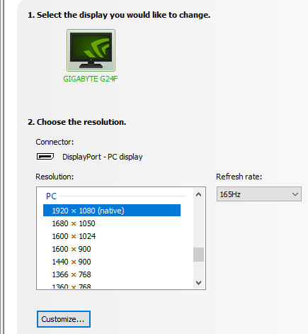 يمكن الاستفادة من خصائص الشاشة كاملة عند توصيلها بكابل DP ليضمن لقة دقة عرض 1920 × 1080 عند 165 هرتز بالإضافة إلى HDR و Adaptive-Sync و يقتصر HDMI 2.0 عند 144 هرتز ويدعم AMD FreeSync و تظهر صورة اعدادات الشاشة المتقدمة فى نظام التشغيل Windows 10 الاعدادات عند توصيل كابل DP مع معدل تحديث 165 هرتز و عند توصيل كابل HDMI مع معدل تحديث 144 هرتز و تظهر ايضا فى اعدادات دقة العرض فى لوحة التحكم الخاصة ببطاقات نفيديا عند توصيل الشاشة بكابل DP