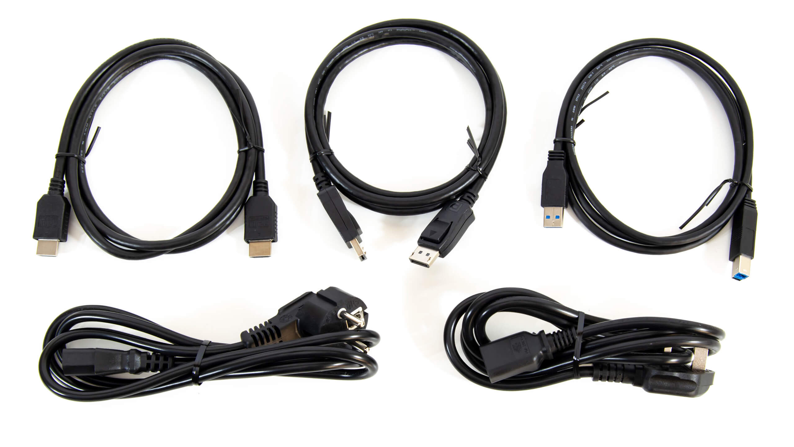 بالداخل و بخلاف وجود الشاشة نفسها داخل الصندوق مرفق مجموعة الكابلات اللازمة لتشغيل الشاشة من خلال وحدة امداد الطاقة مع كابلات توصيل الطاقة بنظاميها و كابلات نقل الصورة من الاجهزة المختلفة و تحتوى على كابل HDMI و DisplayPort ، بالإضافة إلى كابل لموزع USB