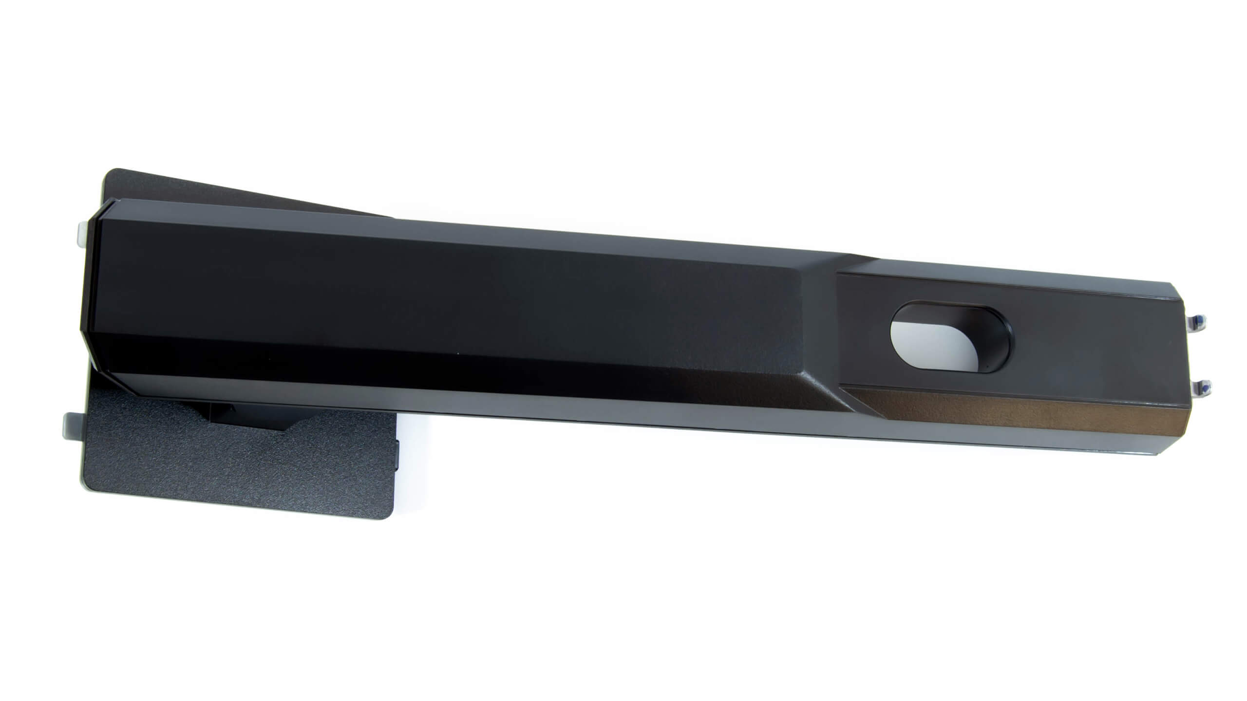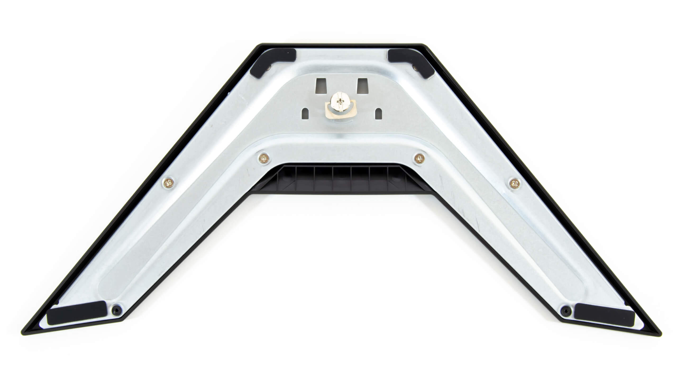 الذراع الخلفى أيضا ياتى منفصل و يبدو كما فى الصورة كبير الحجم و له ثقل مثبت به قاعدة VESA 100X100 تتصل بالشاشة بدون مسامير فقط تقوم بوضعها فى المكان المخصص فى الجزء الخلفى للشاشة و مع ضغطة خفيفة على بنز مخصص لاحكام تثبيتها