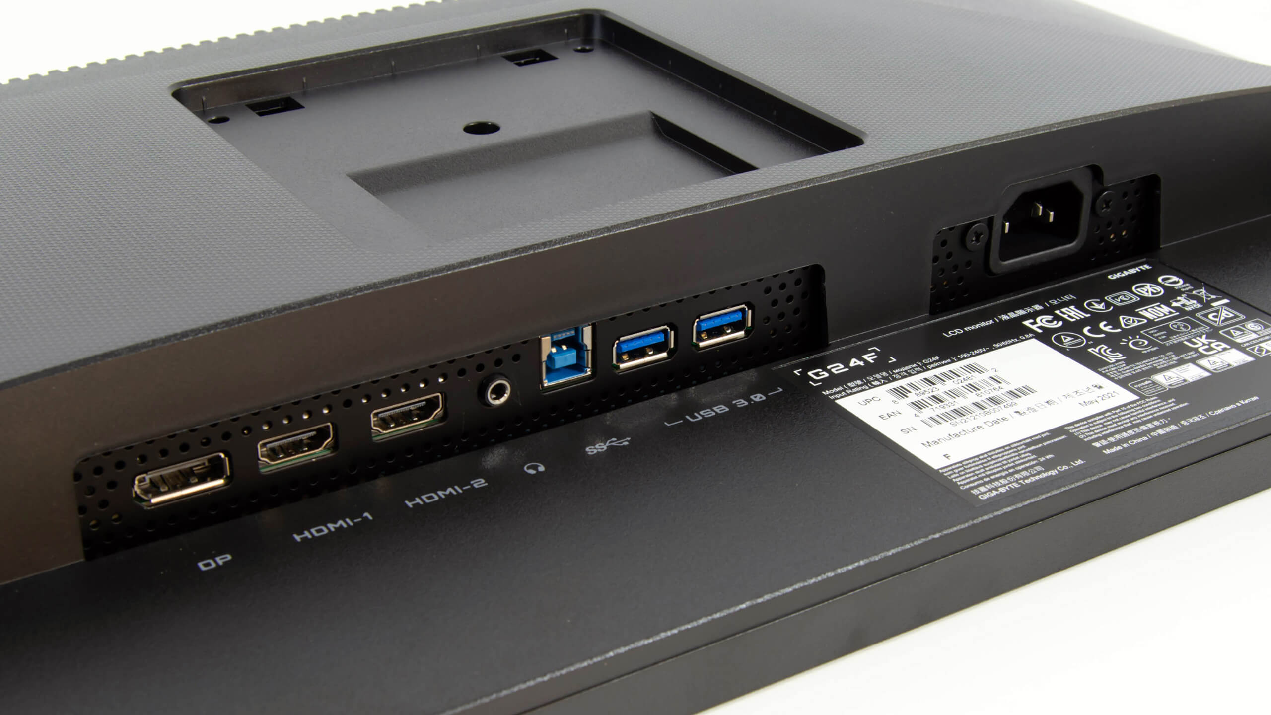 جميع مخارج و مداخل التوصيل لشاشة Gigabyte G24F تتواجد فى المنتصف خلف الشاشة و فى البداية ستخد مدخل لمحول التيار و هو عبارة عن مقبس لكابل طاقة منفصل عن الشاشة و هو ياتى مرفق مع الشاشة مع مزود طاقة و يمكن العثور بجواره على مدخلين USB 3.0 Type A لتوصيل لوحة مفاتيح و الماوس الذى تنوى استخدامهم مع الشاشة ثم بعد ذلك سترى مدخل USB 3.0 من النوع B