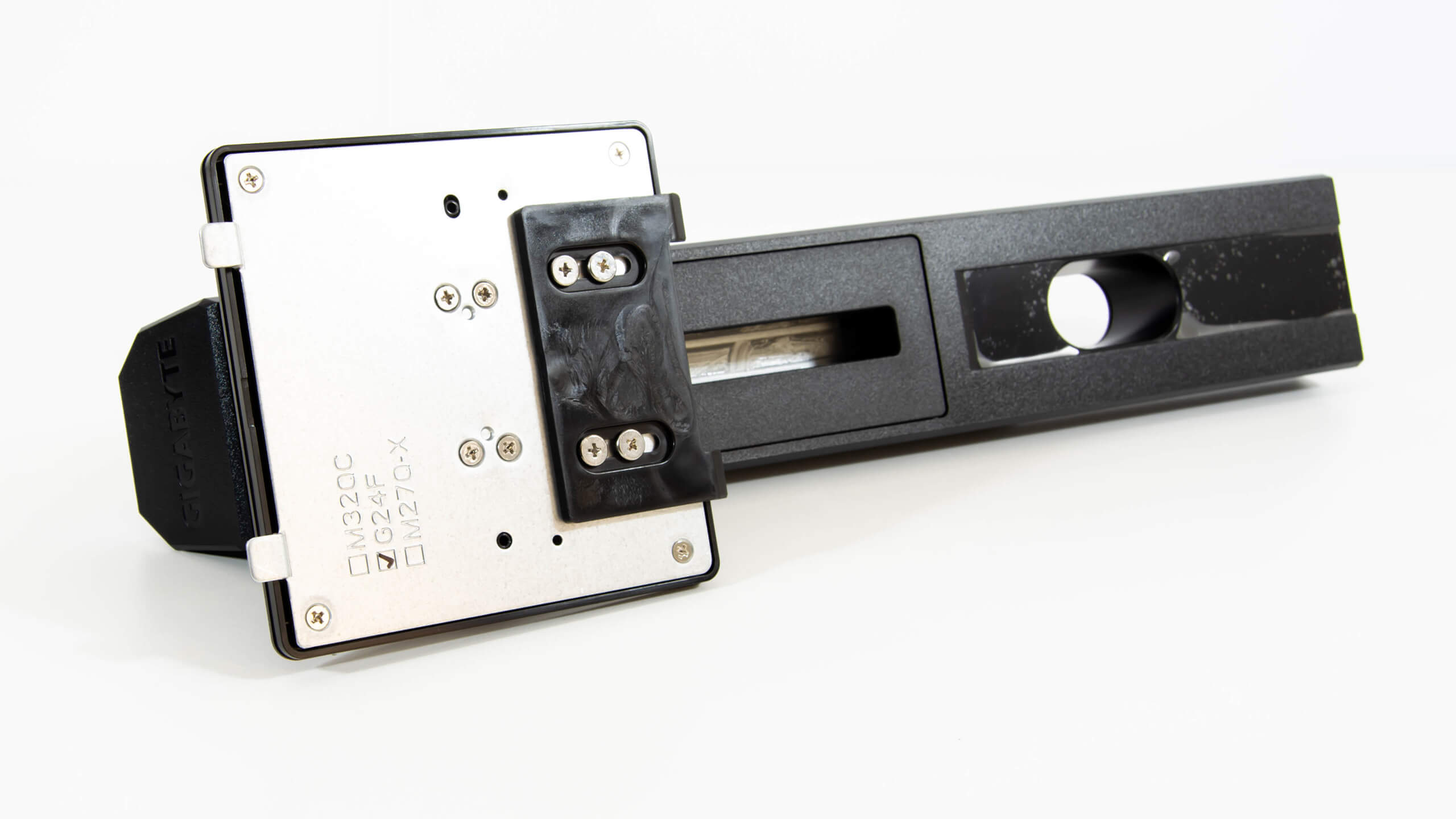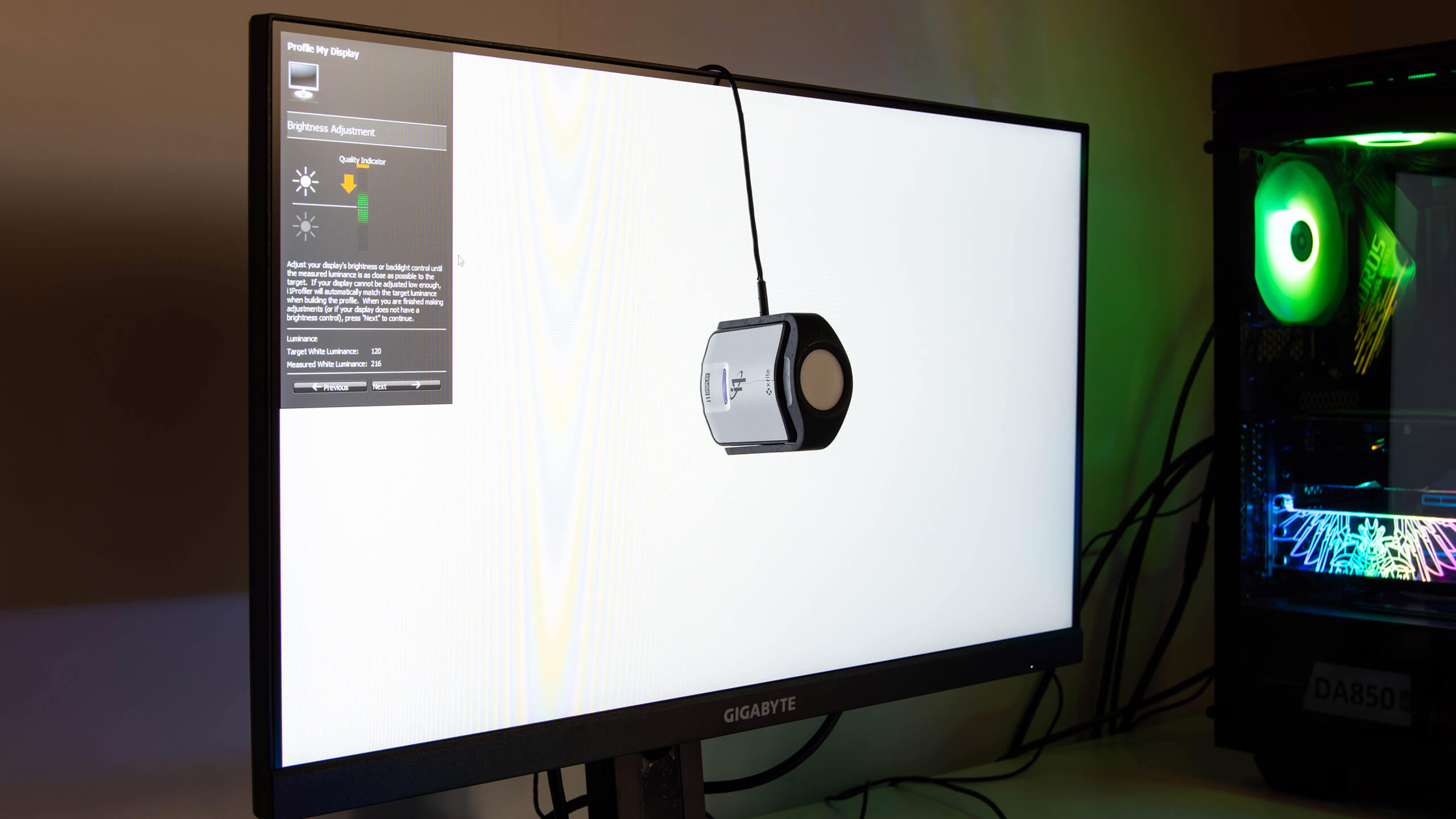 تتميز شاشة Gigabyte G24F بلوحة Super Speed IPS و هى لوحة 8 bits قادرة على عرض 16.7 مليون لون و يجب ان يكون الحد الأقصى للسطوع 300 cd/m2 مصحوبة بنسبة تباين ثابتة تبلغ 1000: 1 و لدينا جهاز x-Rite i1 Display Pro و هو جهاز لمقياس الألوان و معايرة الشاشات