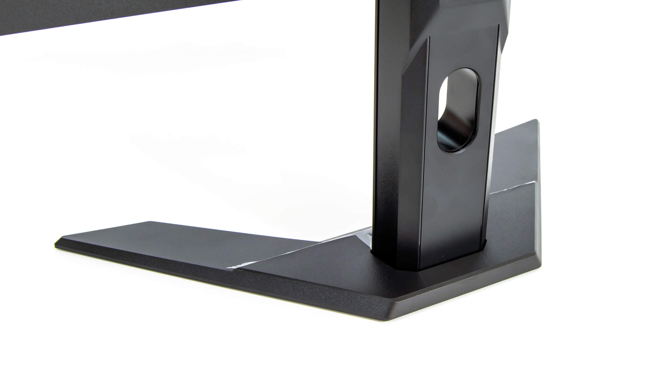 قاعدة التثبيت تأتى منفصلة مثل اغلب الشاشات و مصنعة من المعدن و مغطاة بالبلاستيك و لها ثقل جيد حتى تضمن لك الثبات على سطح المكتب بالاضافة الى وجود قطع مطاطية بالاسفل لتمنعها من الانزلاق