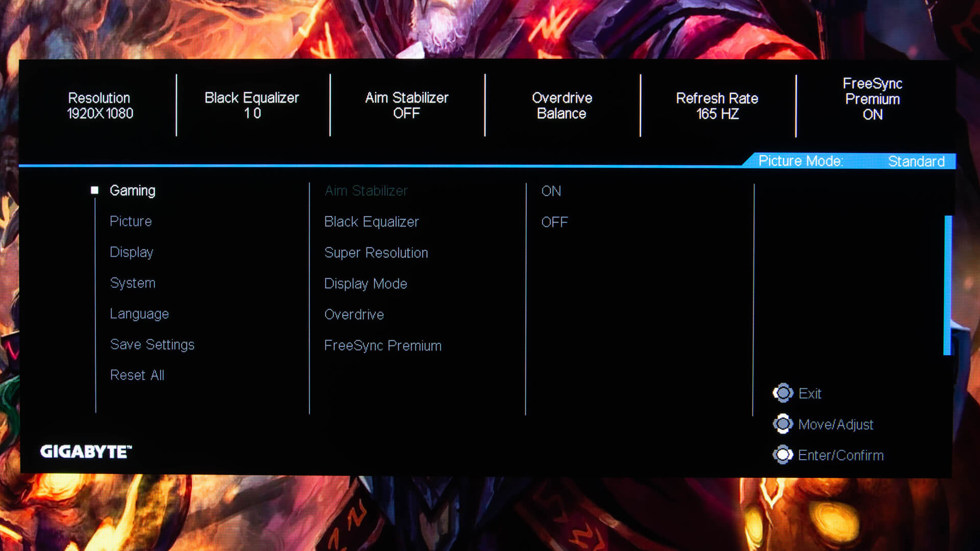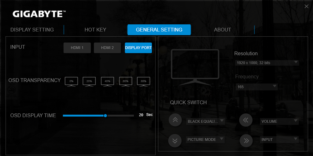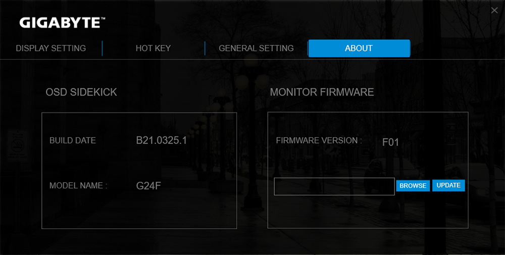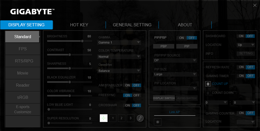 تتيح أيضا Gigabyte تطبيق OSD Sidekick و يوفر نفس الميزات نفسها الموجودة فى زر الاعدادات السابق شرحه و لكن يتم عرضها بشكل مختلف قليلا و قد نظمت Gigabyte الاعدادات بصورة منطقية و هناك العديد من الاعدادات السريعة التى يمكن الاستفادة منها فى تطبيق OSD Sidekick و اهمها امكانية تحديث برامج الشاشة و يمكن تخصيص مؤشر اللعب الخاص بك و حفظ الاعدادات على جهازك و استدعائها مرة اخرى داخل البرنامج و تشغيلها اثناء جلسات الالعاب