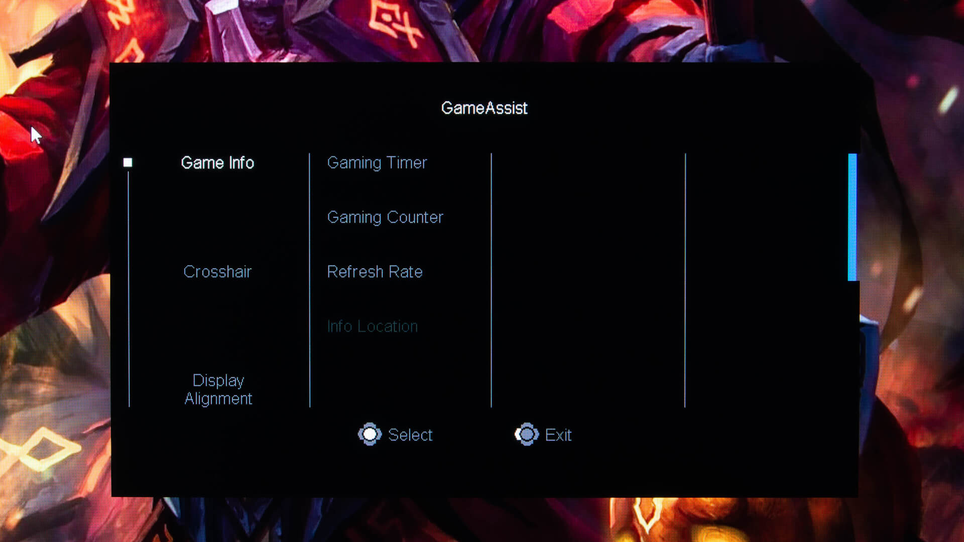 و يؤدى الضغط على العصا جهة اليمين الى استدعاء قائمة وظائف GameAssist و هى تمكنك من اظهار بعض الاشياء المفيدة على الشاشة مثل عدد الاطارات و معدل التحديث كما يمكنك اظهار المؤشر المتقاطع و المؤقت و تتيح لك اختيار مكان وضع كل وظيفة على الشاشة
