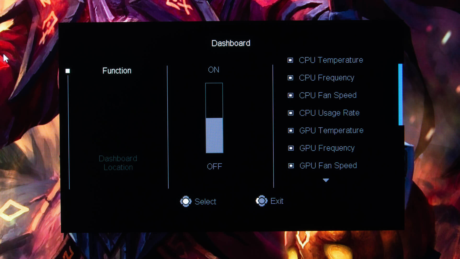 و مع تحريك العصا جهة اليسار ستنتقل الى قائمة Dashboard و التى من خلالها يمكنك اظهار بعض المعلومات على الشاشة اثناء جلسات الألعاب مثل درجات حرارة المعالج و البطاقة الرسومية و سرعة دوران المراوح و الكثير من المعلومات الهامة و هو أمر اصبح سهل بعد ان كنا نلجأ الى برامج خارجية
