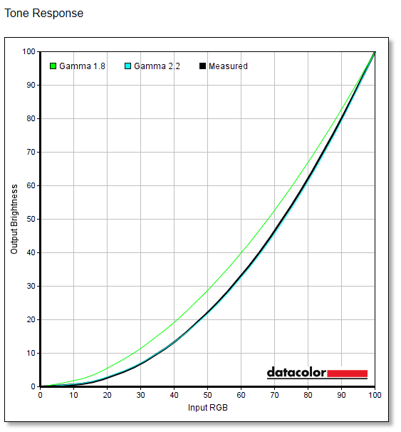 و كان اختبار نسبة Gamma المقاس فى شاشة Gigabyte G24F هو 2 و 2.1 من بين خمسة اصدارات تدعمهم الشاشة و تم تحويلهم تلقائيا الى الاصدارات 1.8 و 2.2 و يظهر الرسم البيانى انحرافا طفيفا عن القيمة المثالية بنسبة تكاد تكون معدومة و نحن ننظر الى القيم فى اعدادات المصنع و قد تم استخدام جهاز DataColor لقياس نسبة Gamma فى شاشة Gigabyte G24F
