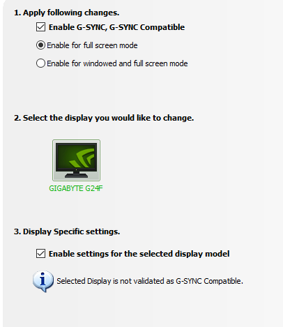 رغم ان خصائص الشاشة لا توضح صراحة ان شاشة Gigabyte G24F تدعم Nvidia G-Sync لكن عند توصيلها بكابل DP و تفعيلها فهى تدعمها من دون أى مشاكل
