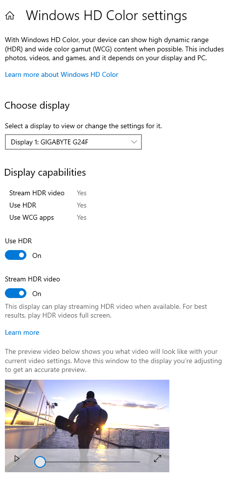 دعم HDR10 هو الأكثر دعما و هو المستخدم فى الألعاب و الأفلام و هو دعم تلقائى فى شاشة Gigabyte G24F و هو يتضمن ظلال ساطعة و ظلال داكنة فى وقت واحد و تكون الشاشة قادرة على عرض نطاق مميز بين الاثنين و ستدعمه الشاشة بشكل مثالى و يسمح لبعض مناطق الشاشة باظهار سطوع قوى بينما يظل جزء اخر أقل سطوعا و يعد انتاج الألوان أيضا جزء مهما من HDR و يستخدم HDR دقة 10 بت على الاقل لكل قناة لون