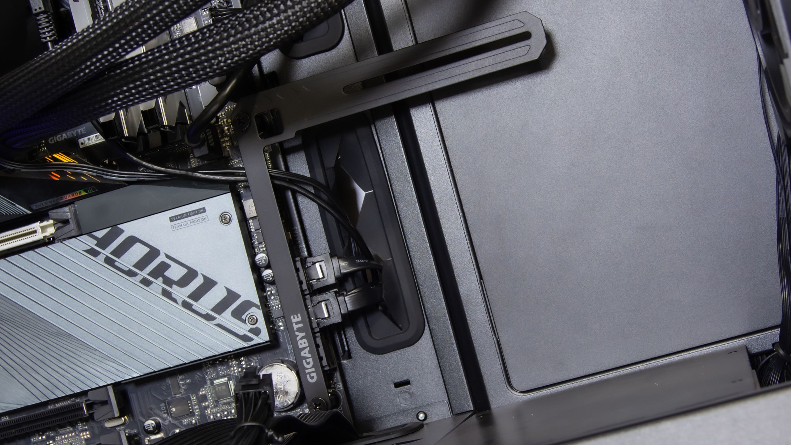 و بهذه الطريق تكون البطاقة مثبتة على الهيكل دون أن تؤثر على منفذ PCIe و هى فكرة رائعة تختلف عن أستخدام الحامل أسفل البطاقة التى تنتهجها العديد من الشركات