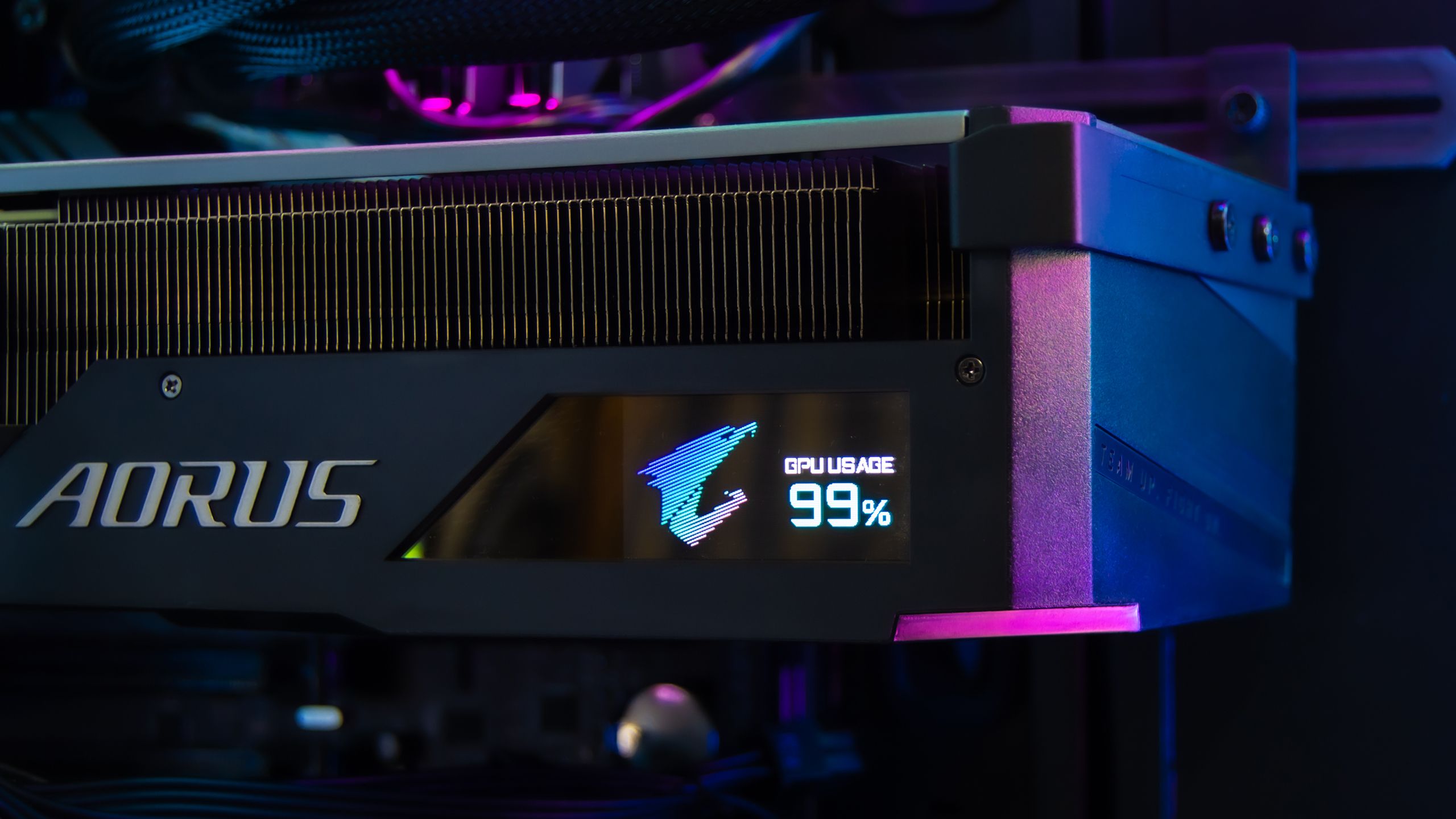 تدعم شاشة LCD الموجودة على البطاقة الرسومية Aorus Master عرض العديد من المعلومات مثل ترددات التشغيل و درجات المراوح و سرعات المراوح و غيرها من المعلومات بالاضافة الى عرض النصوص و الصور و الصور المتحركة