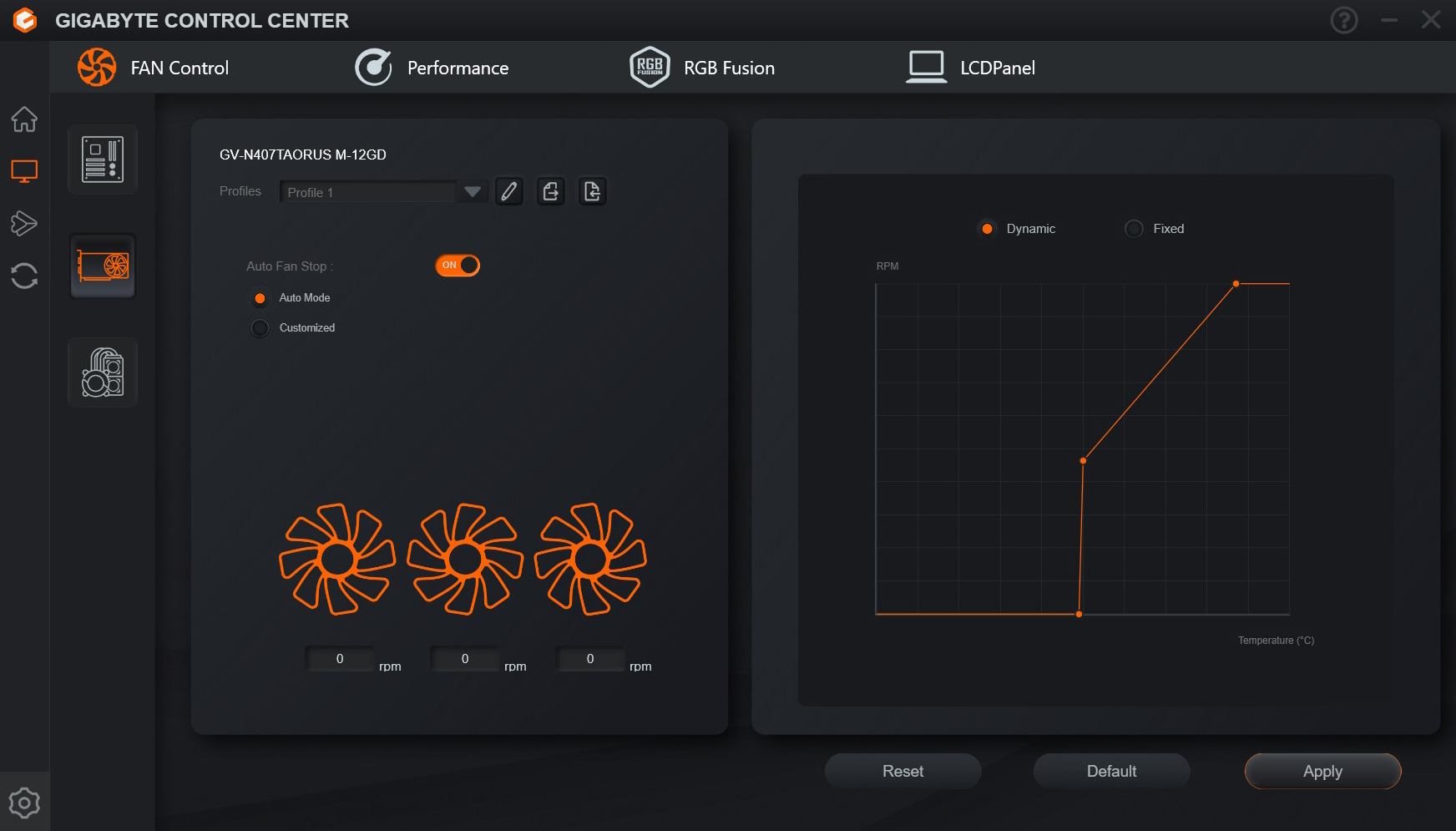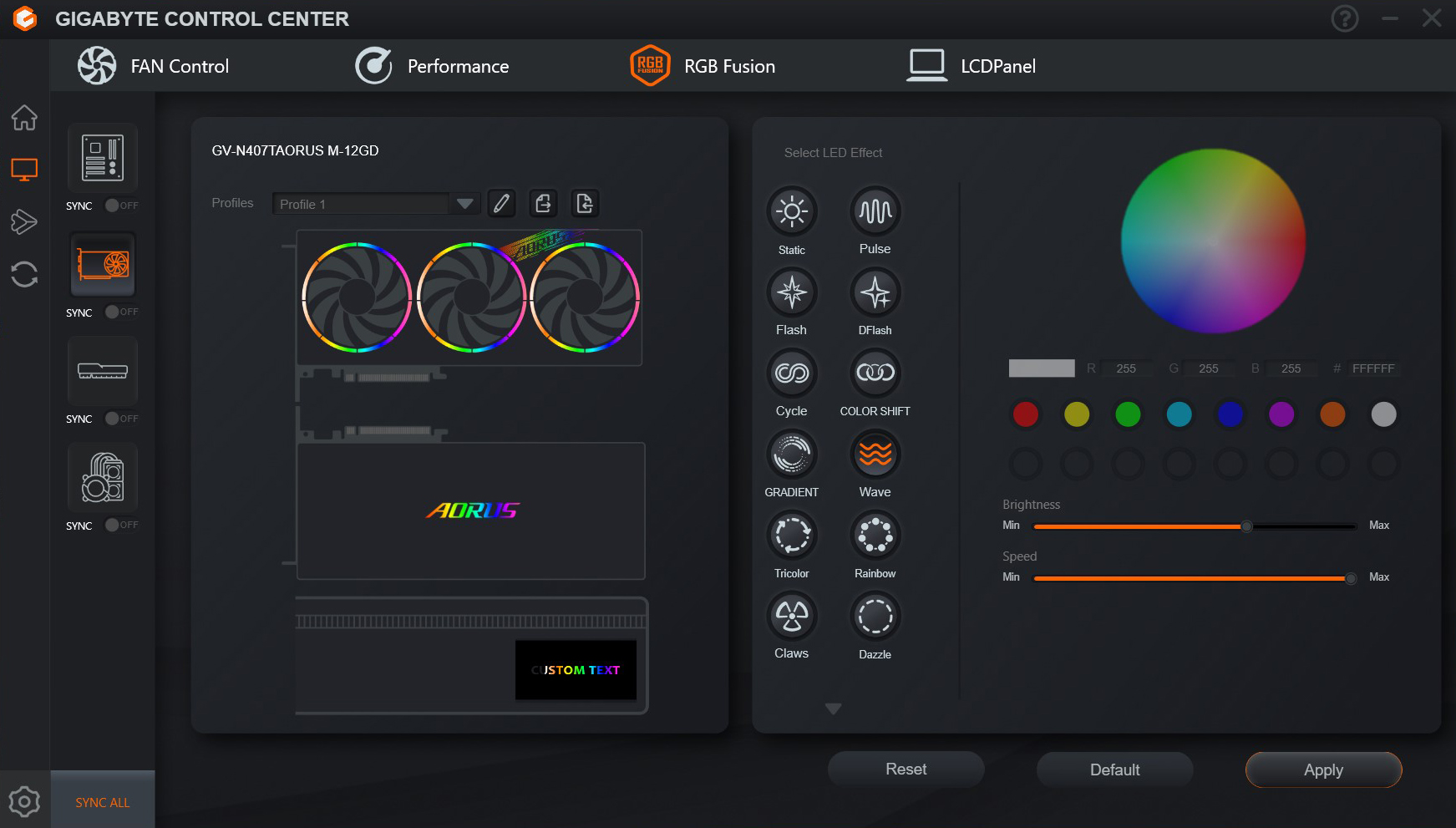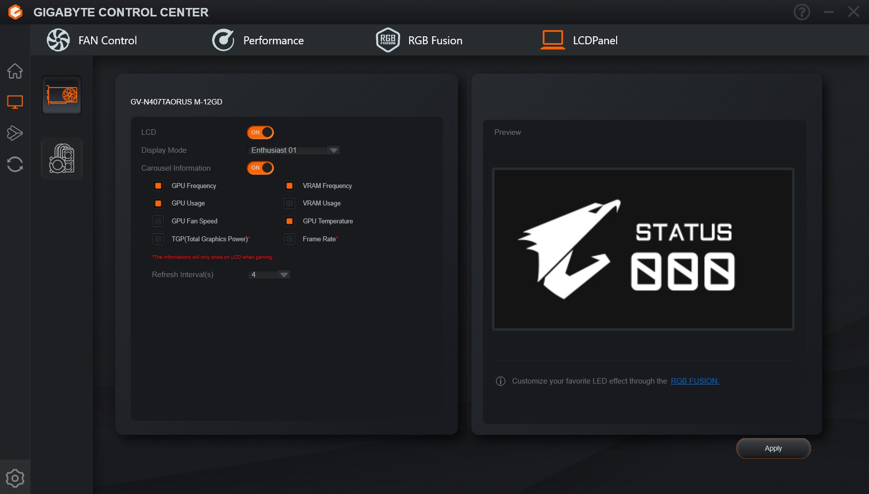 و يمكن من خلال تطبيق GCC التحكم فى سرعة مراوح البطاقة الرسومية RTX 4070 Ti Aorus Master و رفع ترددات التشغيل و اختيار أنماط الأضاءة RGB للبطاقة و تخصيص ما يتم عرضه على الشاشة الموجودة على حافة البطاقة